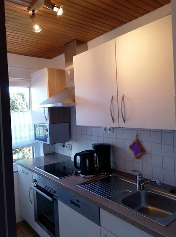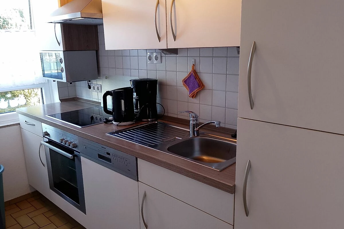 Op de begane grond bevindt zich de volledig uitgeruste keuken (elektrisch fornuis met keramische kookplaat en oven,