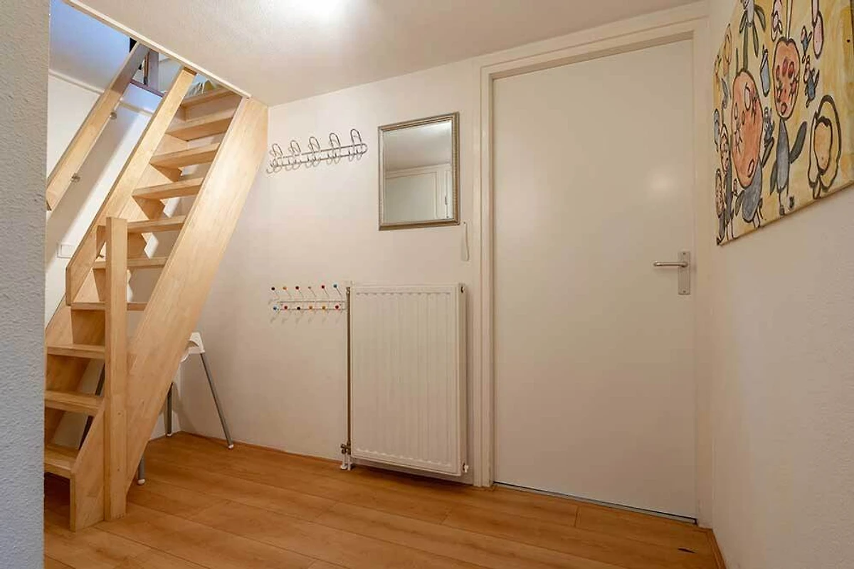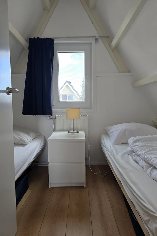 1 grote slaapkamer met een tweepersoonsbed x 2m, planken. Een mooie, lichtjes steile houten trap met leuning leidt naar de eerste verdieping, waar twee slaapkamers: een kamer met twee eenpersoonsbedden een 0,80 x 1,90 m, 1 slaapkamer met 1 enkel bed 0,90 x 2m. Extra logeerbed matras te ontvouwen. Flooring: laminaatvloer, badkamer en damestoilet: tegels.