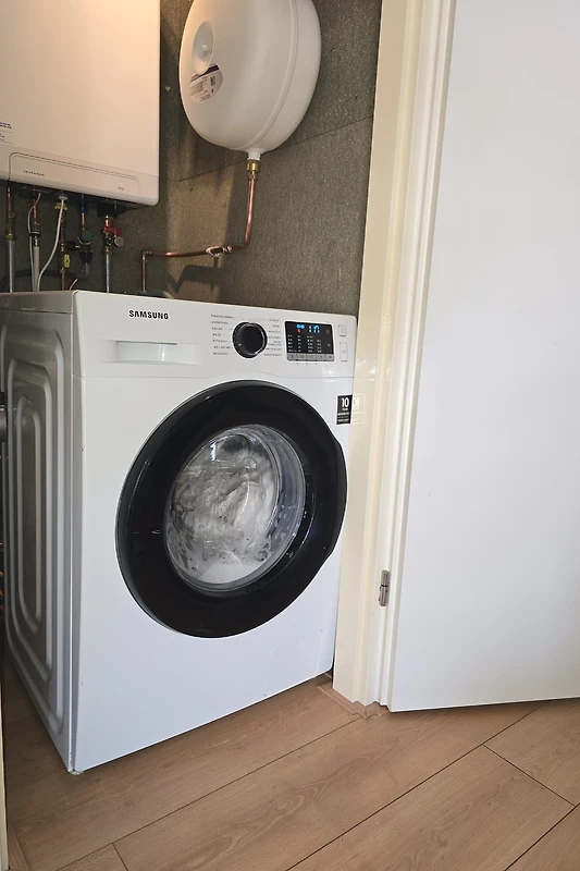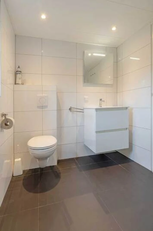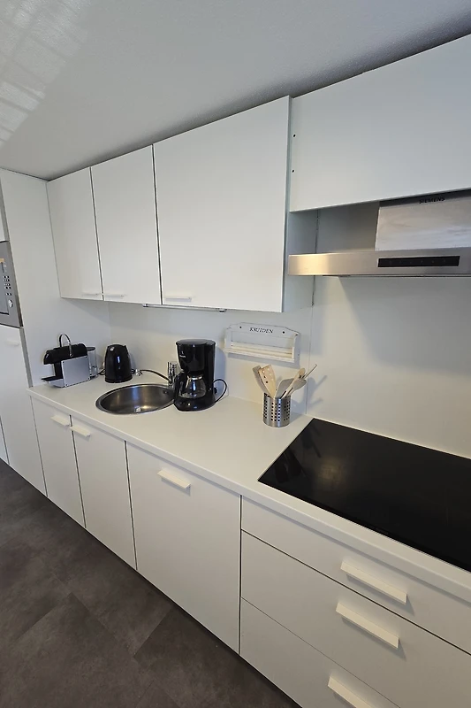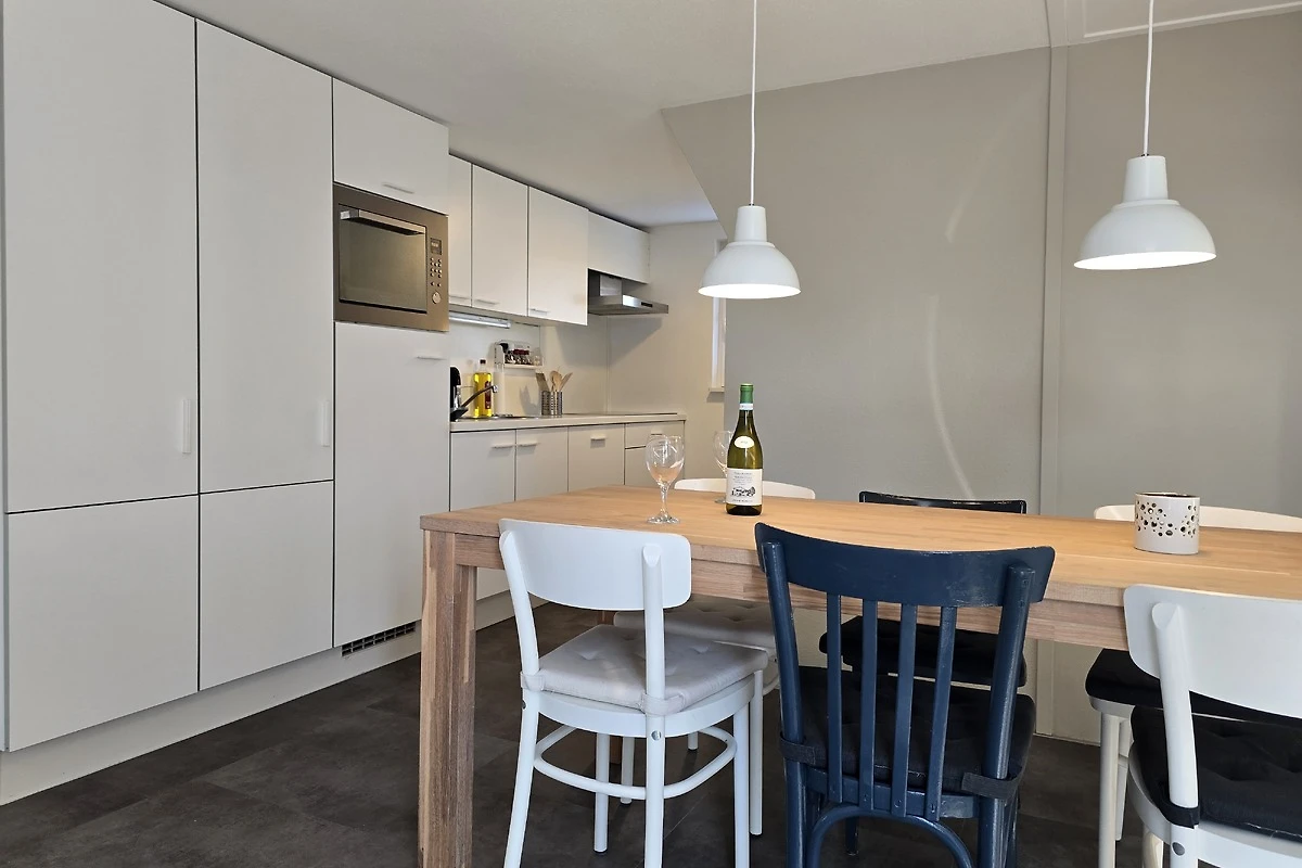 Eethoek: tafel met 6 stoelen, hoge stoelen, moderne, open keuken met 4 pits elektrische kookplaat, combi oven met geïntegreerde magnetron, vaatwasser, koelkast met vriesvak, waterkoker, koffiezetapparaat, tosti-ijzer. Badkamer met douche, toilet, wastafel.