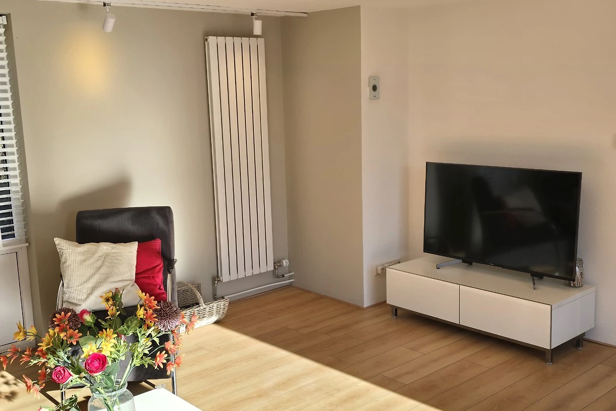 ongeveer 110 vierkante meter leefruimte. Op de begane grond zijn: Zeer mooie, ruime woonkamer met moderne bank, 3 fauteuils, kabel-tv (flatscreen) met 6 Duitse programma's, DVD-speler, radio-cd-speler, boeken en bordspellen.
