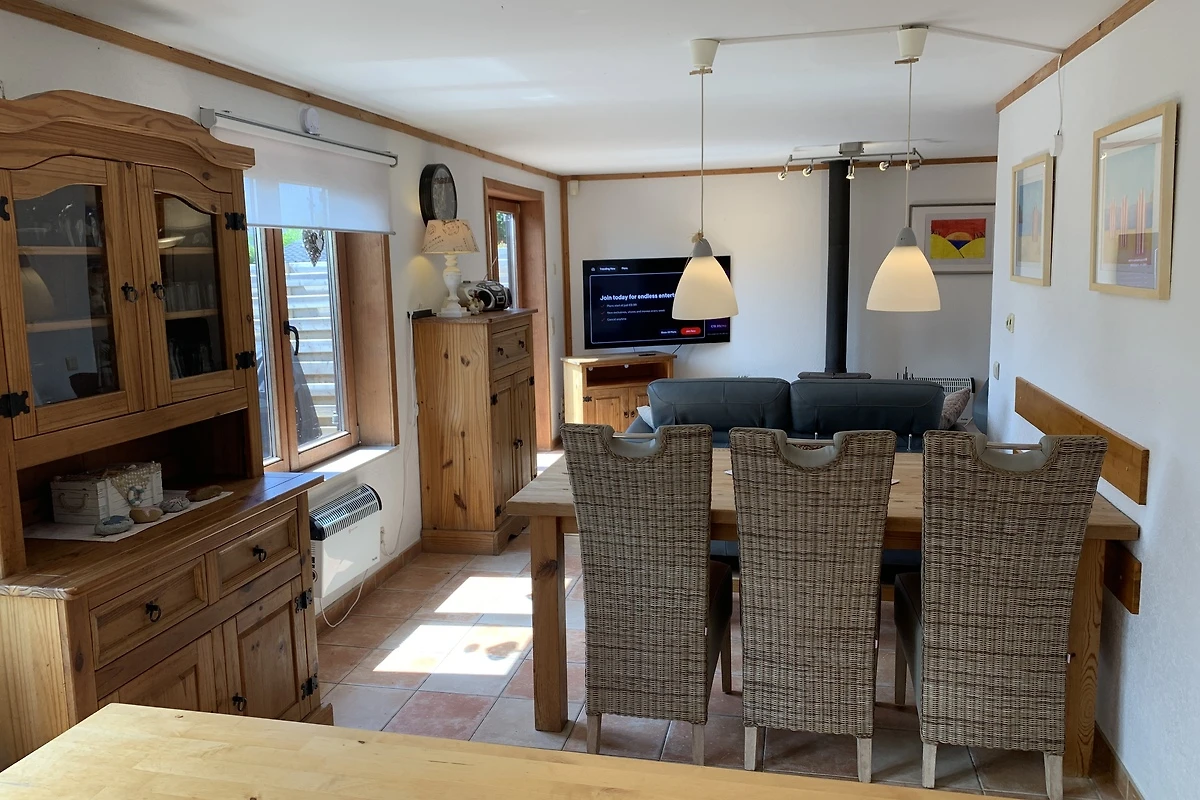 De woonkamer is zeer gezellig en stijlvol ingericht. De Zweedse kachel zorgt voor een bijzondere huiselijke sfeer. Voor vermaak is er satelliet-tv, een stereo-installatie en diverse spelletjes en boeken. De keuken is volledig uitgerust met keramische kookplaat, koelkast, vriezer, magnetron en oven. Vaatwerk is ruim voorhanden. Je zult niets missen.