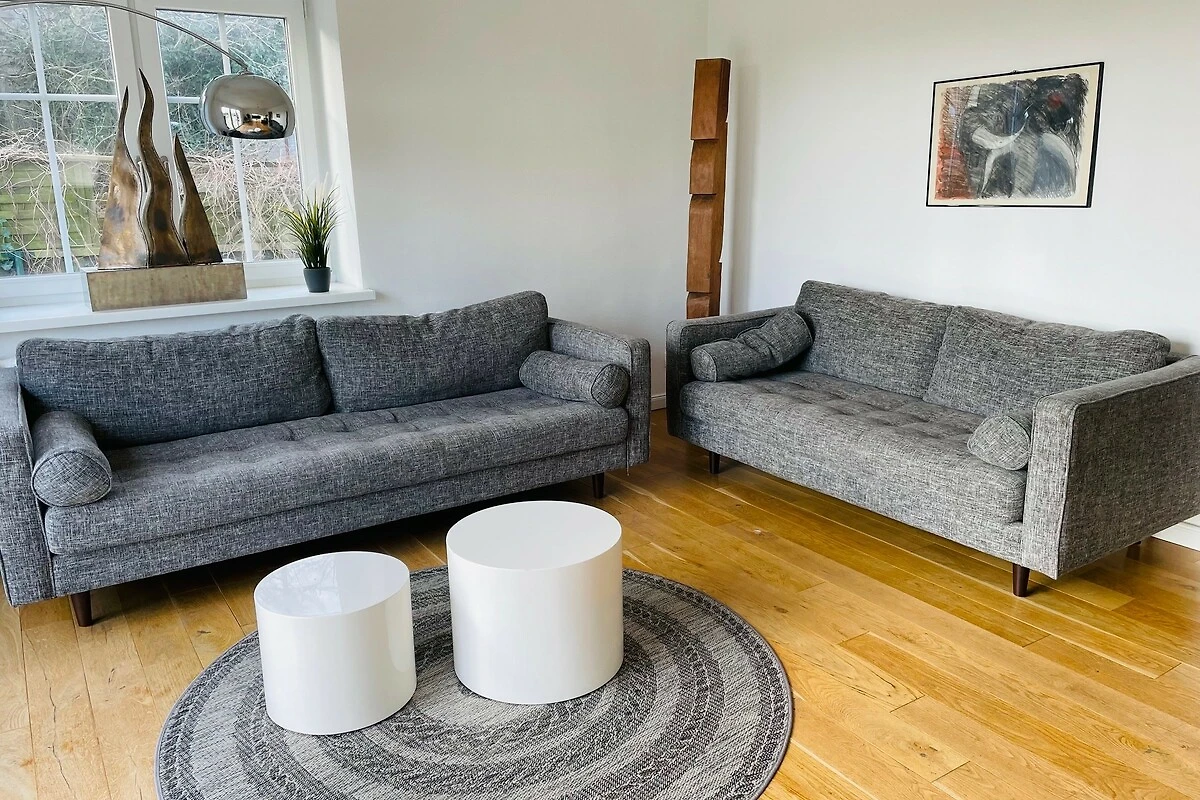 110 m², een royale woonruimte met open haard en toegang tot het 40 m² grote houten terras en de enorme 800 m² tuin met uitzicht op het groen, een grote, moderne woonkeuken, een aparte saunaruimte, 2 badkamers, 3 slaapkamers, een kleine bibliotheek en een schatkist met spelletjes en zelfs een tafeltennistafel met batjes die zowel binnen als buiten gebruikt kan worden.