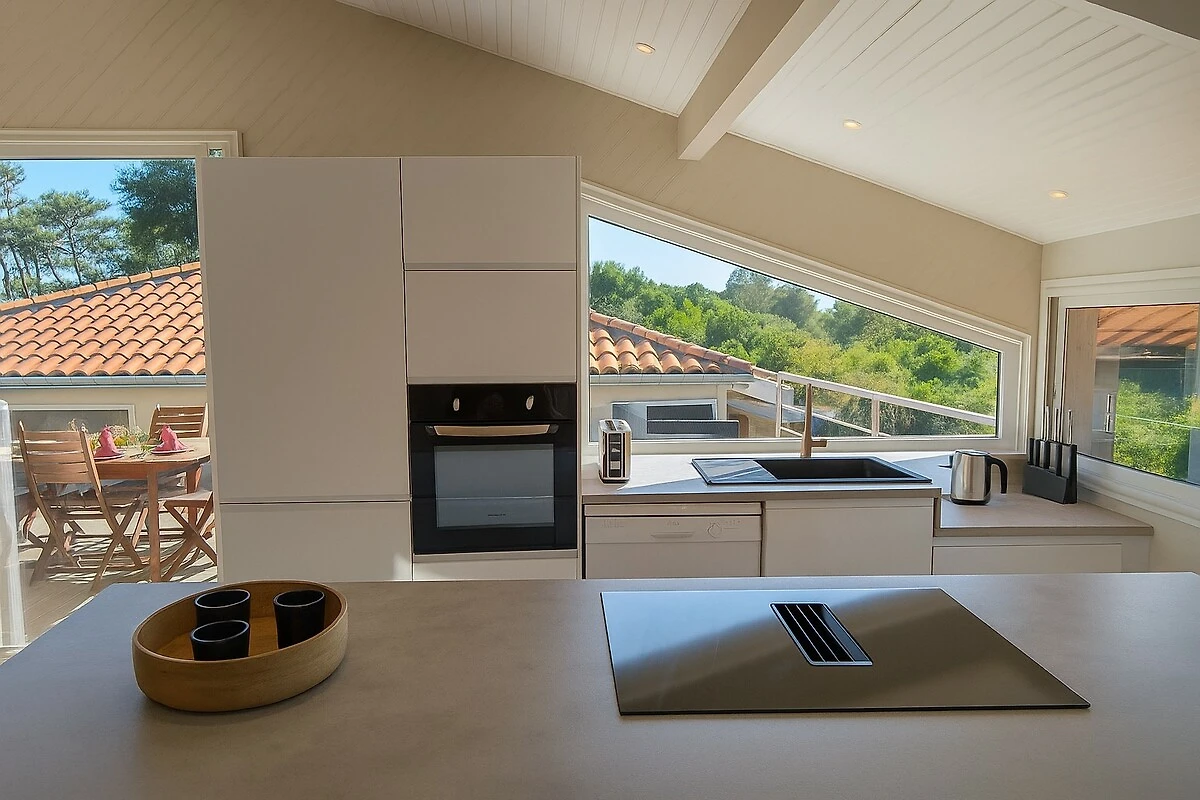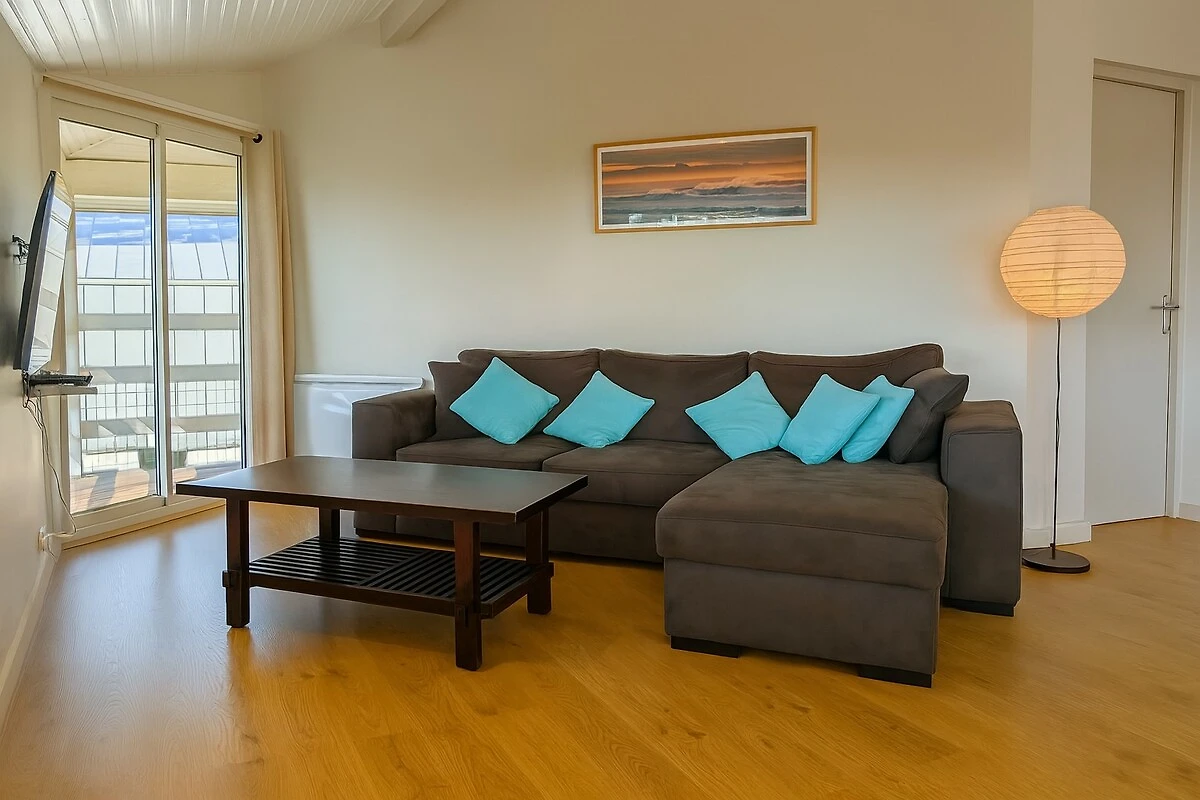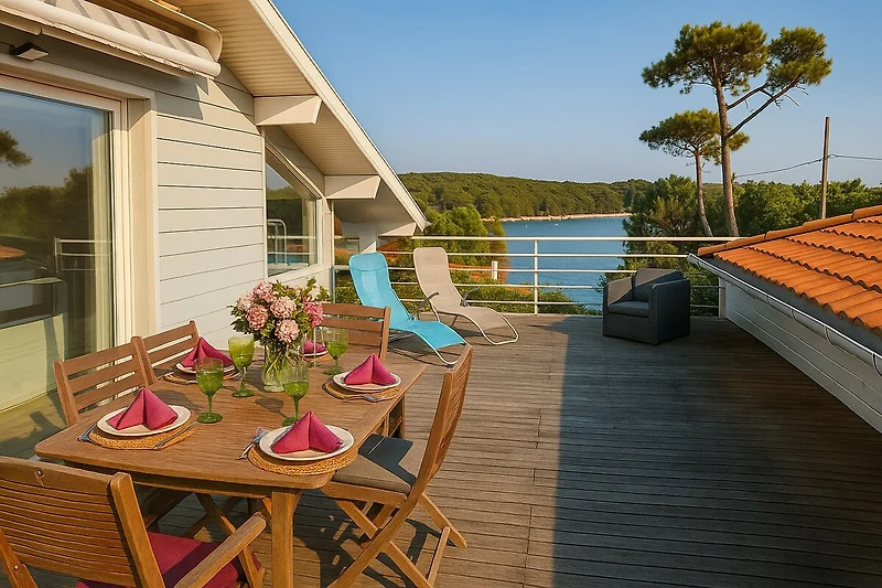 Van daaruit heeft u toegang tot het ca. 50 m2 grote, deels overdekte balkon met tuinmeubelen en ligstoelen, vanwaar u zowel over het meer van Hossegor (zie foto) als over de duinen van de Atlantische Oceaan kunt uitkijken. Een barbecue is ook beschikbaar.