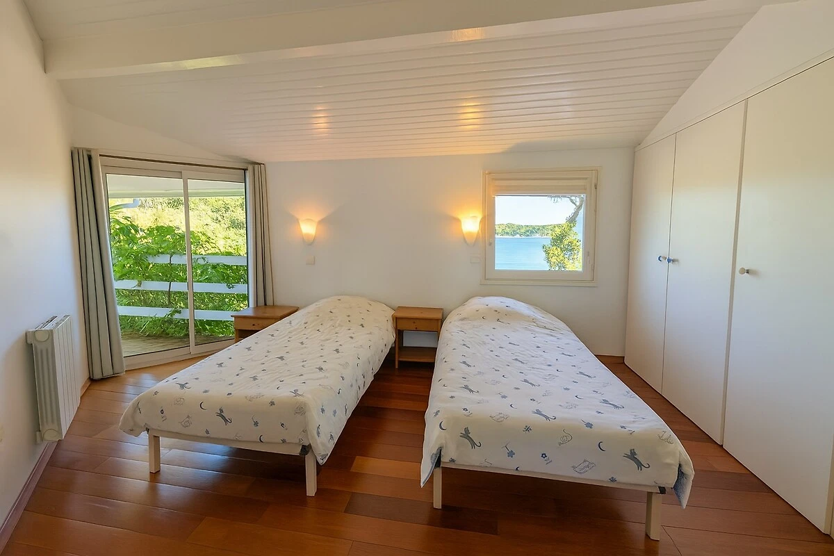 Er zijn twee slaapkamers met respectievelijk een tweepersoonsbed (160 cm breed) en twee eenpersoonsbedden. De slaapkamers delen nog een balkon met zeezicht. Beddengoed is aanwezig. Badkamer met wastafel en bad. WC apart.