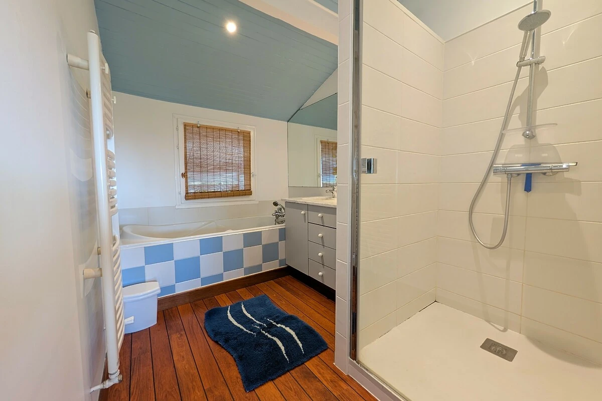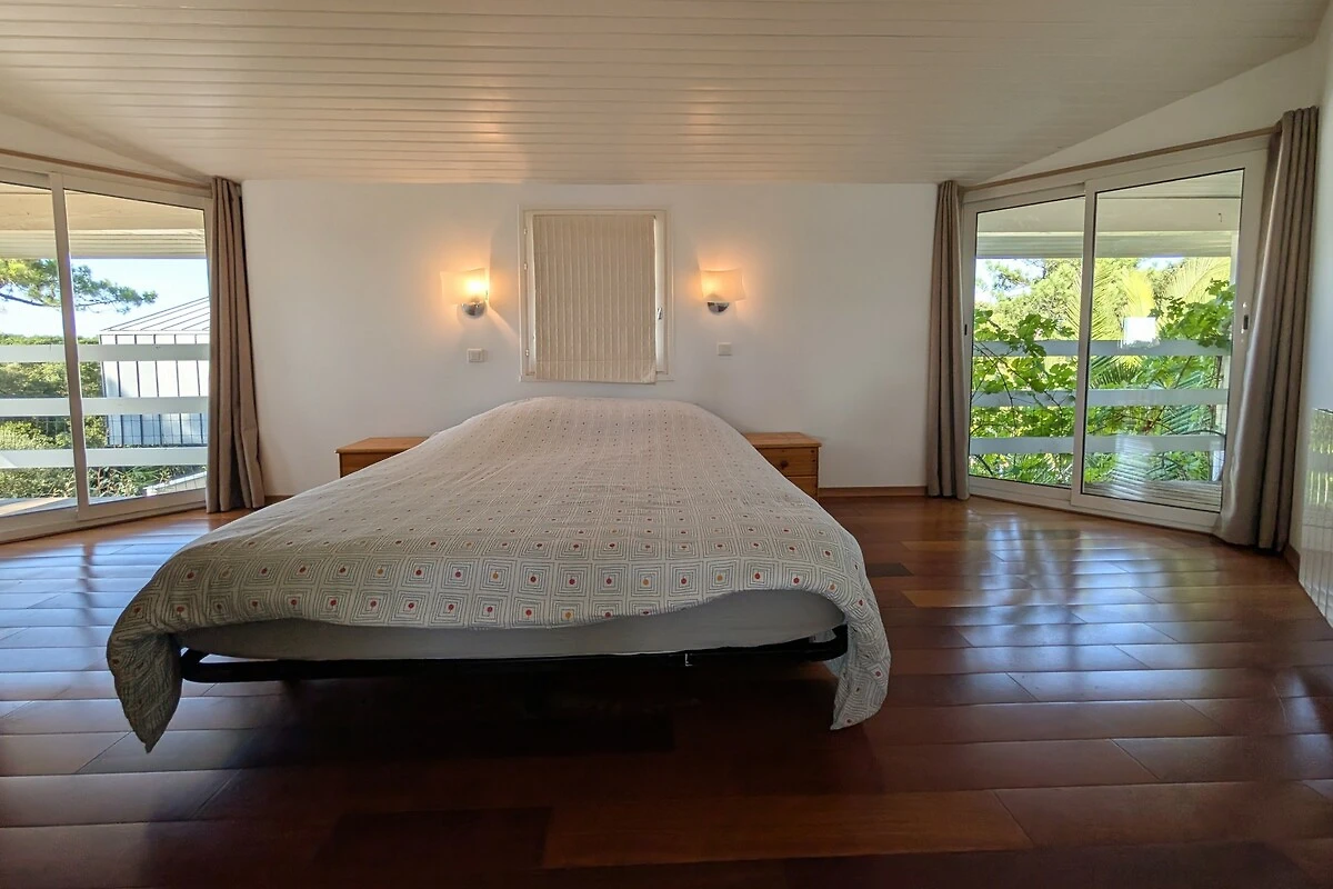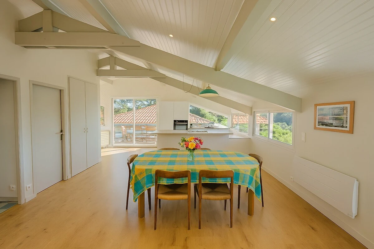 De flat bevindt zich op de bovenste verdieping van een ruime 2-gezinswoning, in de mooiste wijk van Hossegor, namelijk tussen het zoutwatermeer en de Atlantische Oceaan. Het appartement op de begane grond wordt apart verhuurd. Door de aparte ingangen zijn beide flats volledig autonoom, zonder contactpunten.
