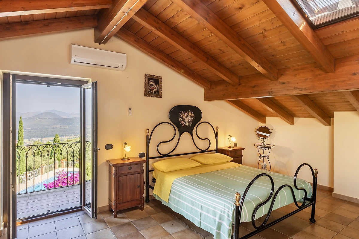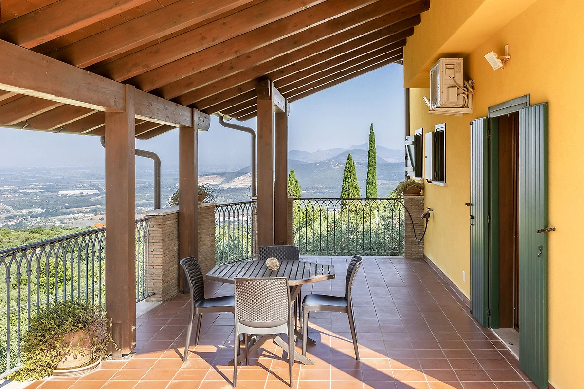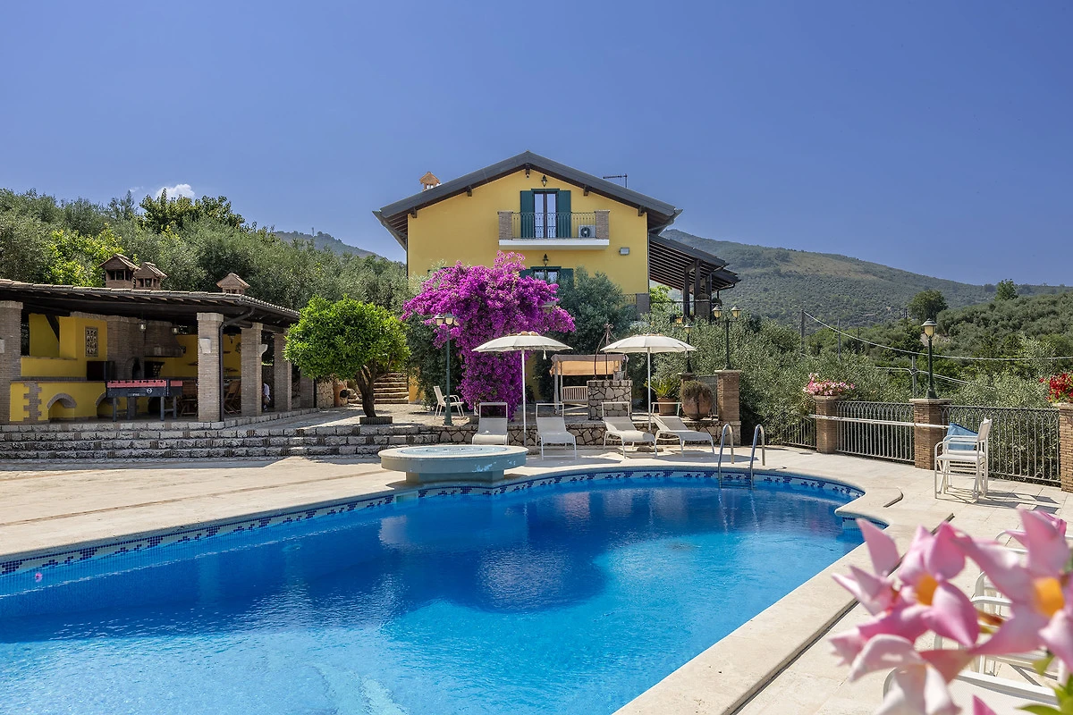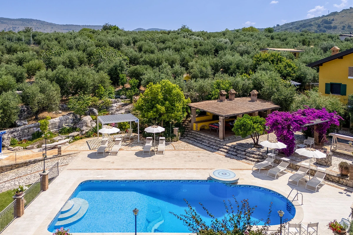 Het zwembad met groot zonneterras, is uitgerust met ligbedden en parasols en genieten van een prachtig uitzicht over de vallei. Naast het zwembad is er een schuur met hout oven, spoelbak, gas en alles wat je nodig hebt om comfortabel te dineren buiten: een grote tafel en eerste verdieping van de villa is er een groot terras met tafel en stoelen.