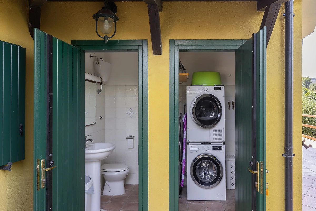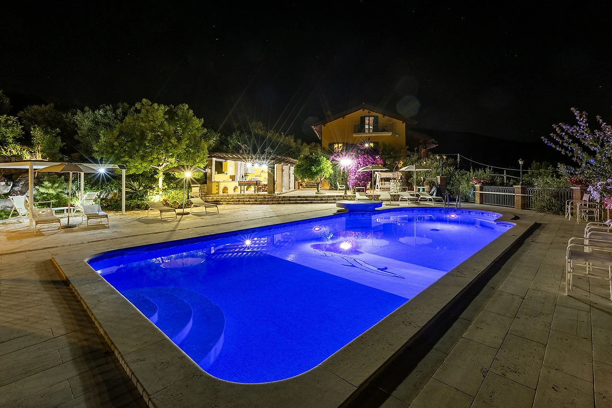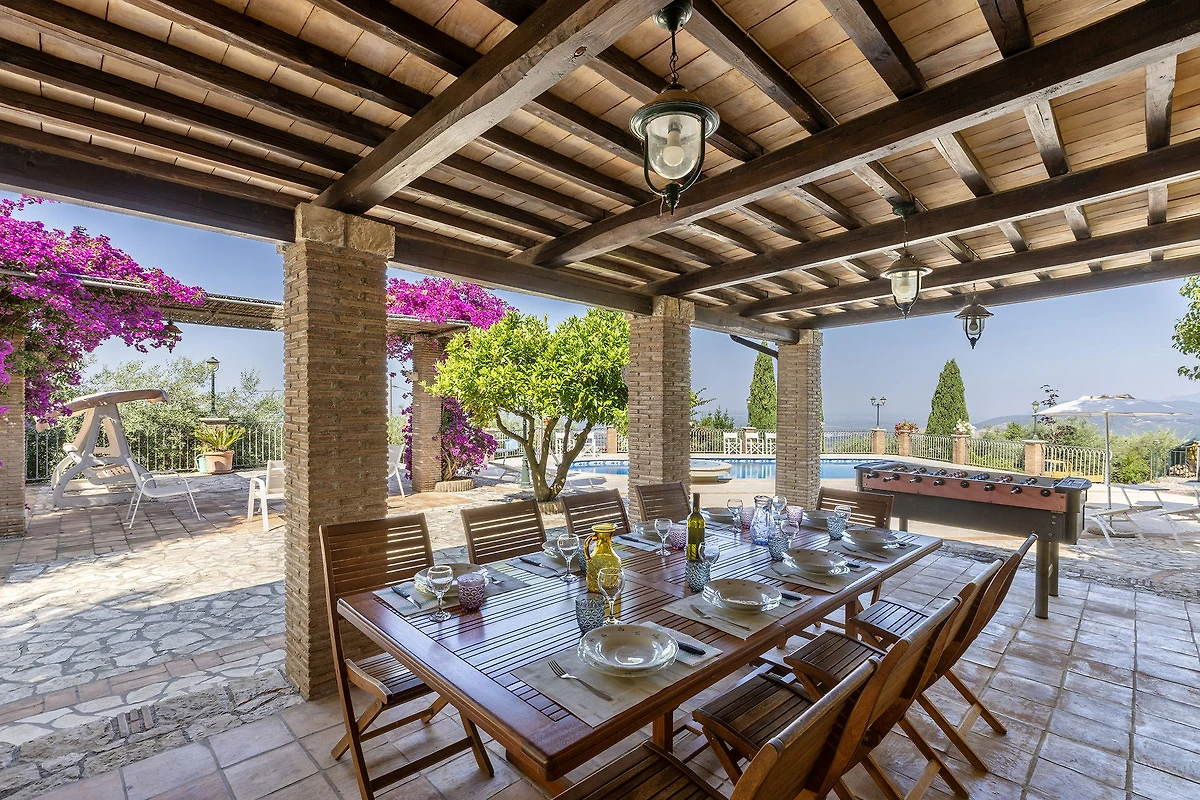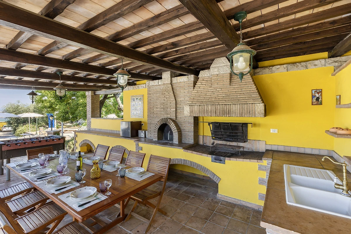 Het zwembad met groot zonneterras, is uitgerust met ligbedden en parasols en genieten van een prachtig uitzicht over de vallei. Naast het zwembad is er een schuur met hout oven, spoelbak, gas en alles wat je nodig hebt om comfortabel te dineren buiten: een grote tafel en eerste verdieping van de villa is er een groot terras met tafel en stoelen.
