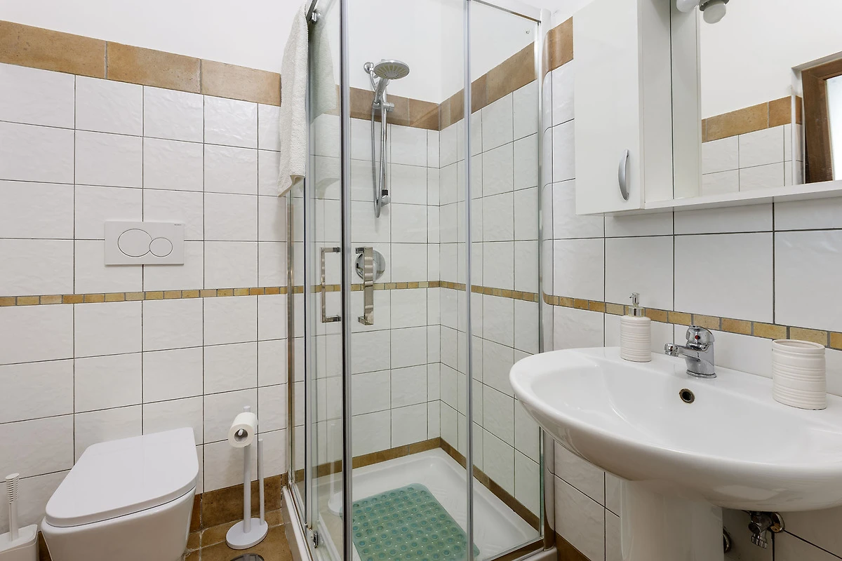 - een slaapkamer met twee eenpersoonsbedden en eigen badkamer met douche;