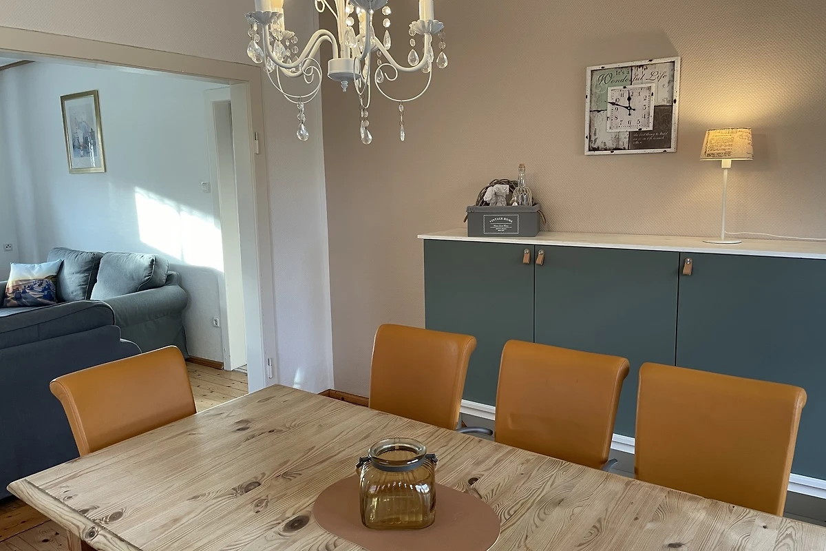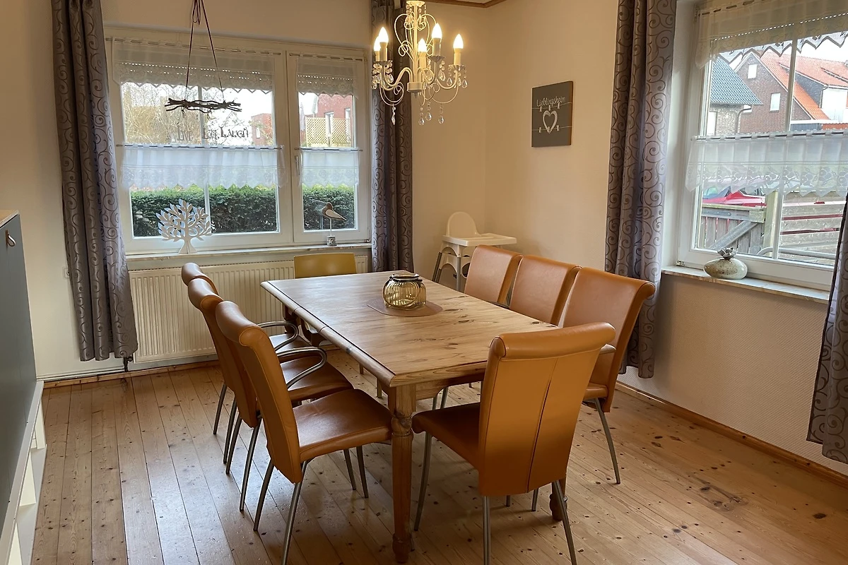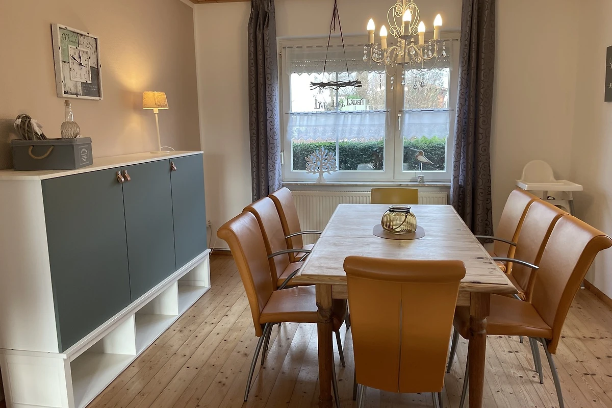 De eetkamer bevindt zich in de eetkamer, met een grote eettafel. Er zijn zelfs 2 kinderstoelen beschikbaar. Verder zijn er boeken, kinderboeken en spelletjes aanwezig.