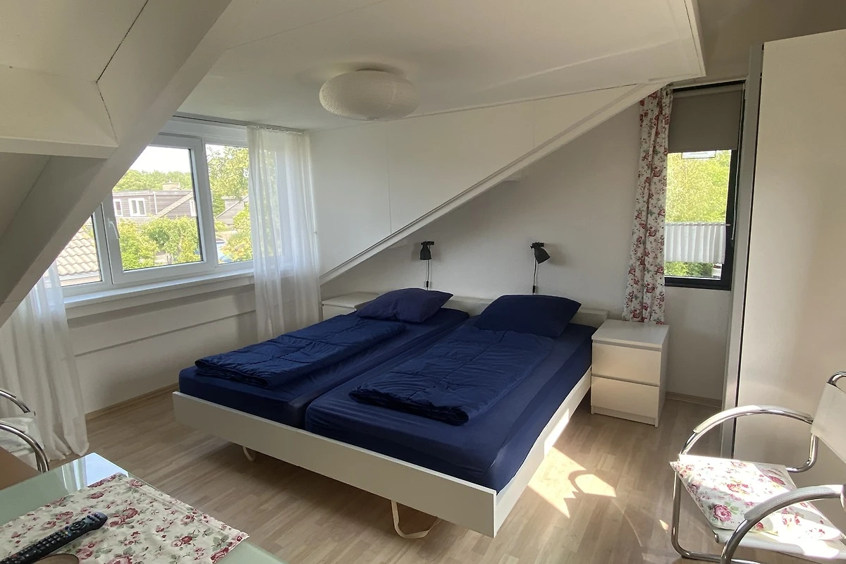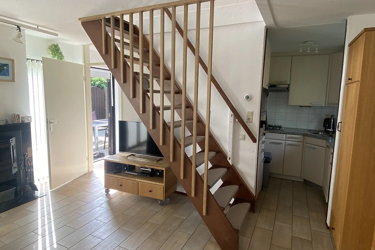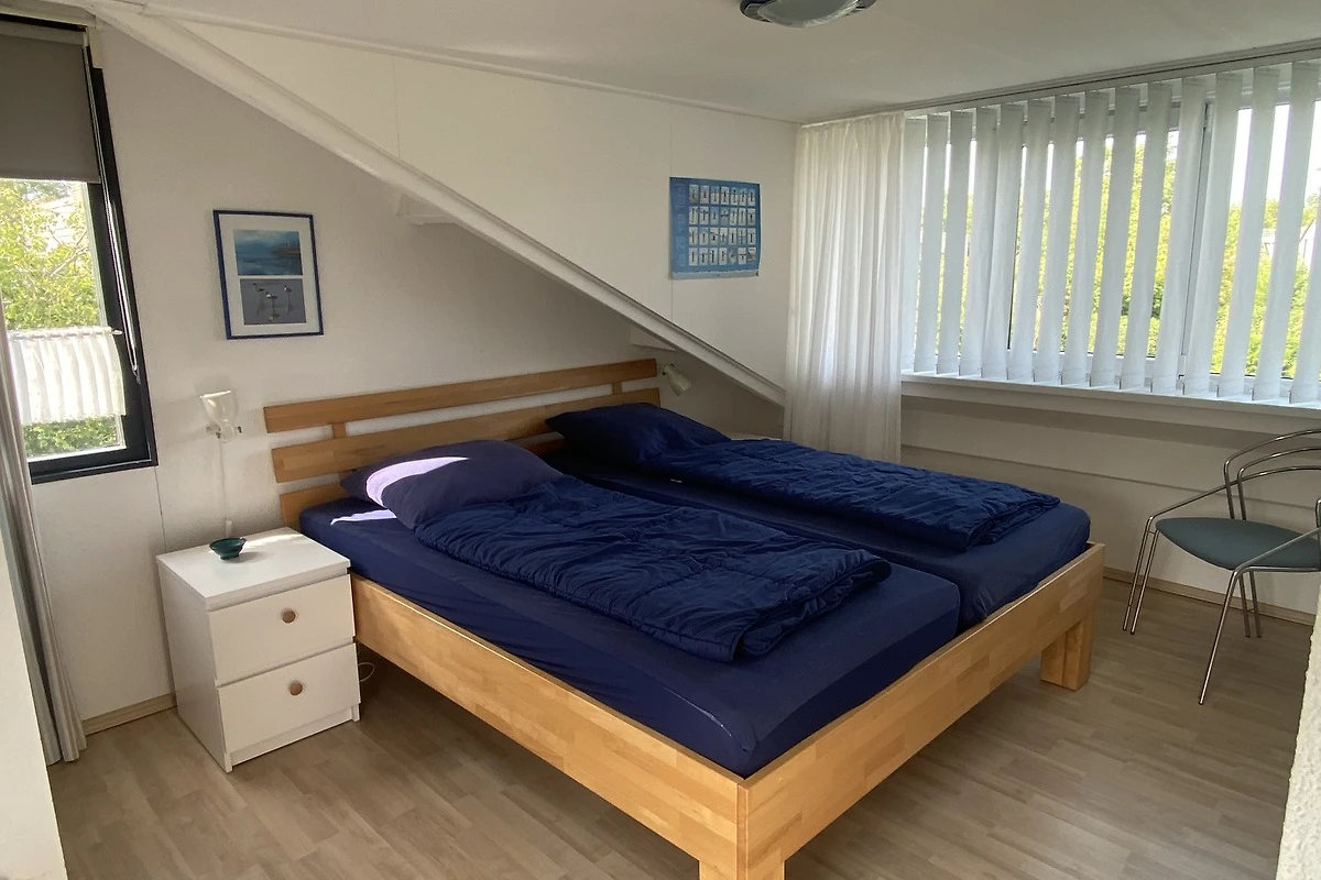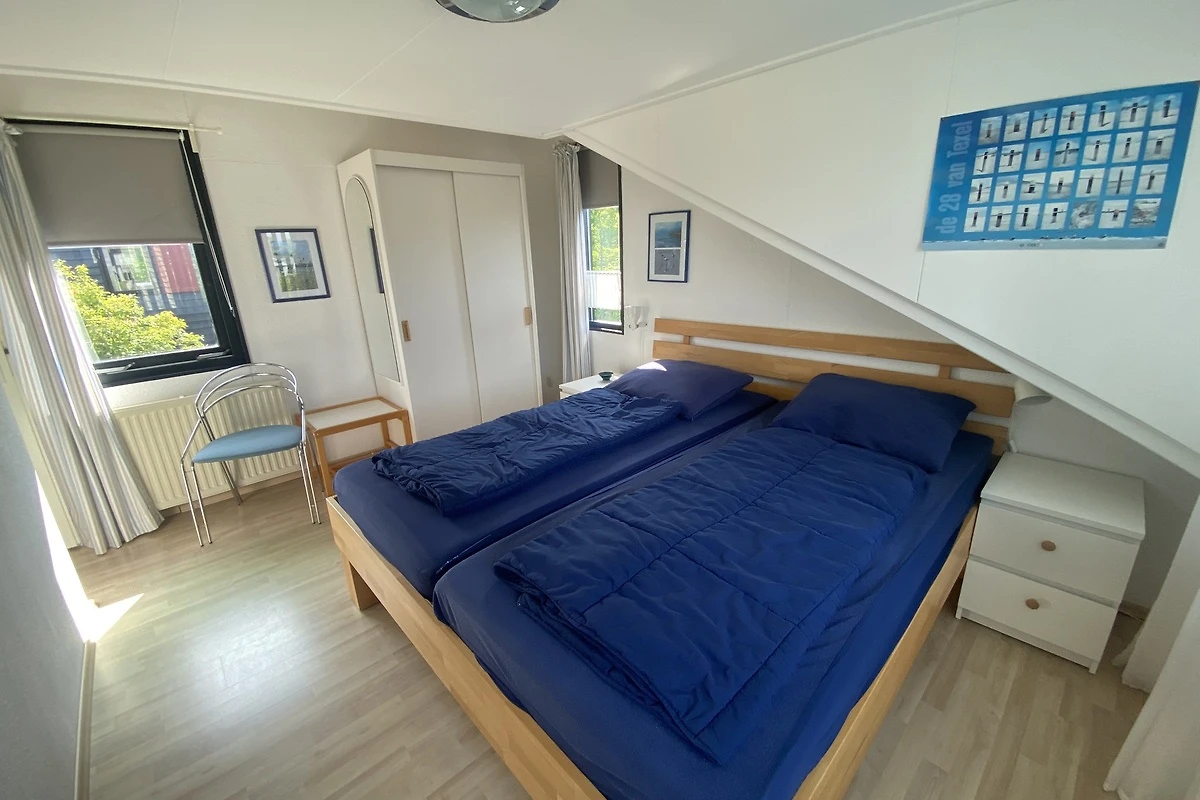 Vanuit de woon-eetkamer leidt een trap naar de bovenverdieping [de trap is niet geschikt voor mensen met een loopbeperking]. Daar bevinden zich beide slaapkamers, die zijn voorzien van lichte, ruime dakkapellen. Elke slaapkamer heeft twee eenpersoonsbedden [2 bedden van 90 x 200 en 2 bedden van 100 x 200]. Een lichte badkamer met Velux-raam, douche, wc en wastafel is bereikbaar vanaf de bovenhal. Op de bovenverdieping zijn de kamers voorzien van laminaat, respectievelijk de badkamer van tegels.
