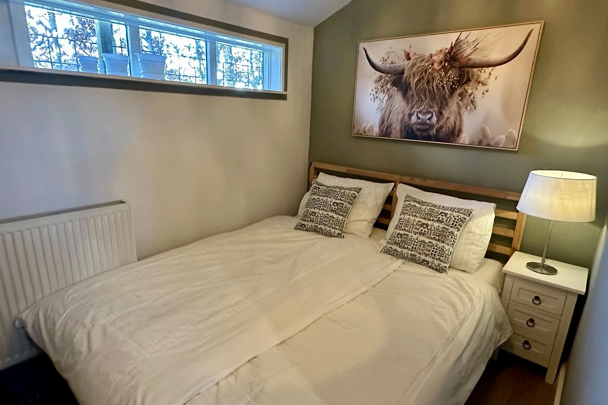 De lichte en liefdevolle ingerichte woonkamer met bank, een grote TV en tuindeur naar het terras / tuin. WiFi is beschikbaar. De slaapkamer is klein en beschikt over een tweepersoonsbed (160x200) en ramen. Het bed is opgemaakt bij uw aankomst. Kleine badkamer met douche, wastafel en toilet.