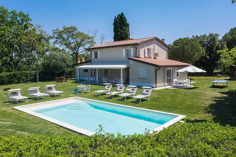 Villa Selene, omgeven door groen op slechts 4 km van de Adriatische kust, is een vakantiehuis met een privézwembad en uitzicht op zee in Pesaro. Het gedeeltelijk omheinde terrein strekt zich uit tot een grote tuin met olijf- en fruitbomen, met een prachtig zoutwaterzwembad met een Romeinse trap. Een gemeubileerde veranda nodigt u uit om buiten te lunchen en dineren, met een barbecue klaar voor heerlijke gegrilde maaltijden en een vuurplaats die de perfecte achtergrond biedt voor avonden onder de sterrenhemel. Er is ook een pingpongtafel beschikbaar voor spelletjes met vrienden of familie. De villa is een uitstekend startpunt om de omgeving te verkennen: van de stranden van Pesaro tot de ruigere kustlijn van Fiorenzuola di Focara, met stops bij talloze lokale visrestaurants, tot historische dorpjes zoals Gradara, de kunststad Urbino en de Republiek San Marino. In elk seizoen biedt Villa Selene de sfeer en de ware kleuren van het platteland van de Marche, op slechts een steenworp afstand van de zee.