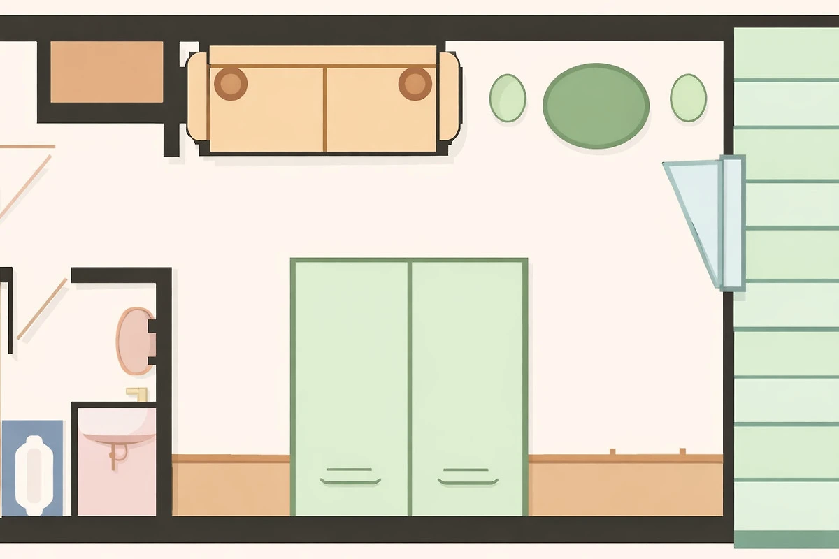 Zelfgemaakte meubels van natuurlijk hout en warme kleuren stralen een behaaglijke sfeer uit. Vanaf het balkon op het zuiden heeft u een onvergetelijk uitzicht over de wijde omgeving. 22 vierkante meter wordt royaal benut.