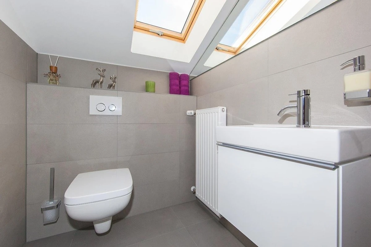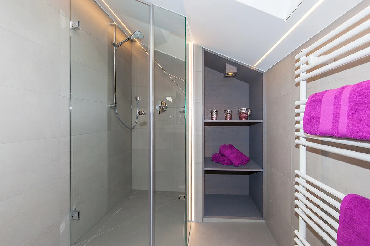 Badkamer: Nieuwe lichte badruimte met inloopdouche van echt glas op grondniveau, vloerverwarming, badjassen, cosmetica, handdoekverwarmer, daglichtbad, apart toilet.