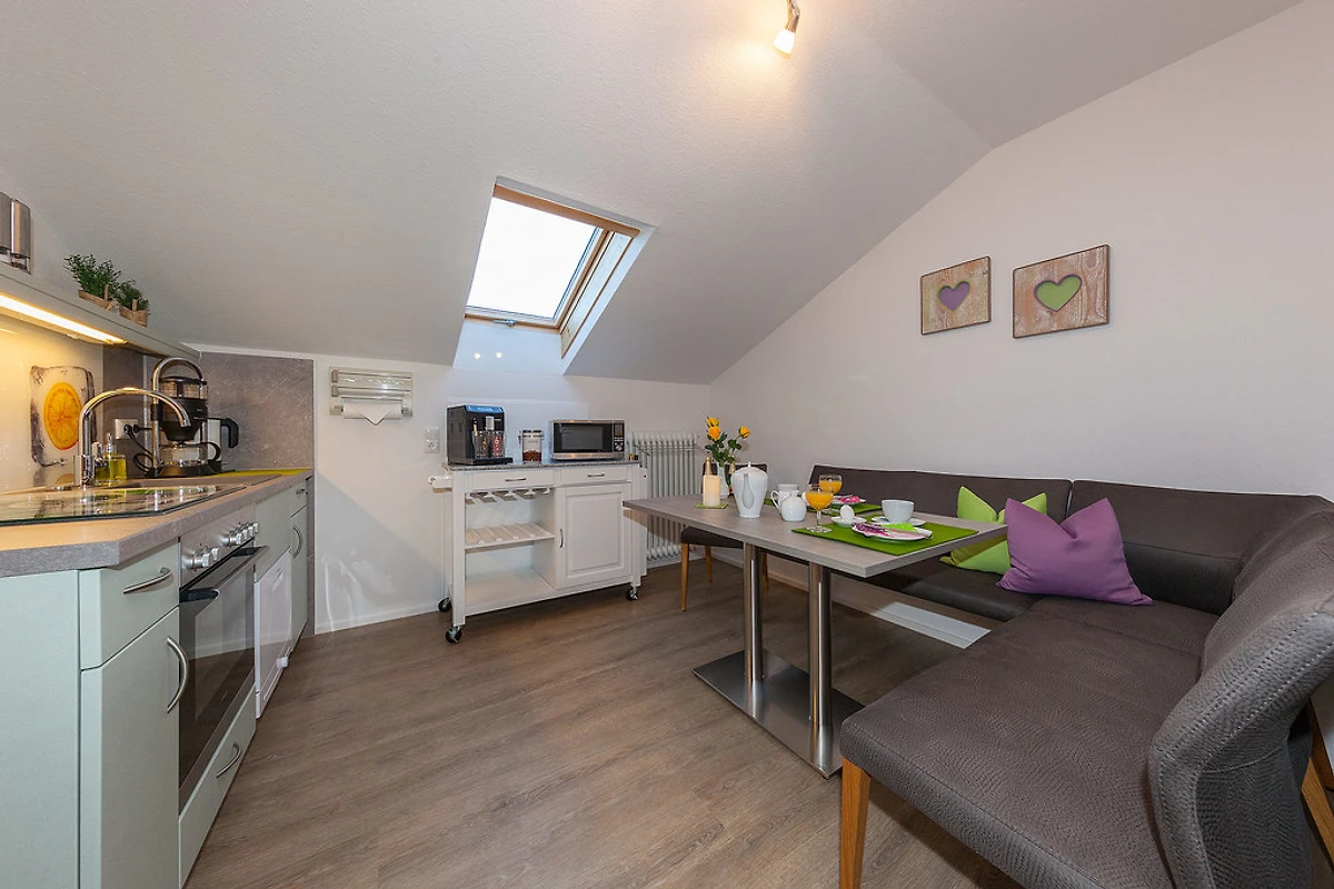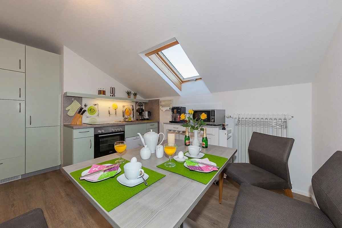 Woonkamer: Helder nieuwe leefruimte met grote hoekbank. Belangrijke opmerking: De lederen stoel zoals te zien op de foto's, is niet meer aanwezig. Nieuw is nu de vormschoonheid van de stoel Deluxe en zijn uitschuifbare, volledig complete matras waarmee uw woonkamer in een handomdraai in een 2e slaapkamer kan worden omgetoverd! Uitschuifmechanisme in slechts enkele seconden. Ligoppervlak: B100 cm x L200 cm, (geschikt voor koppels die apart willen slapen). , Bartafel met barkruk, LED-televisie, kleine HiFi-set. Keuken: Volledig uitgeruste kitchenette, 4-pits keramische kookplaat, vaatwasser, Siemens volautomatische koffiemachine, koffiefilterapparaat, waterkoker, magnetron, koelkast met vriesvak, oven, eethoek, allerlei kookgerei, enz.