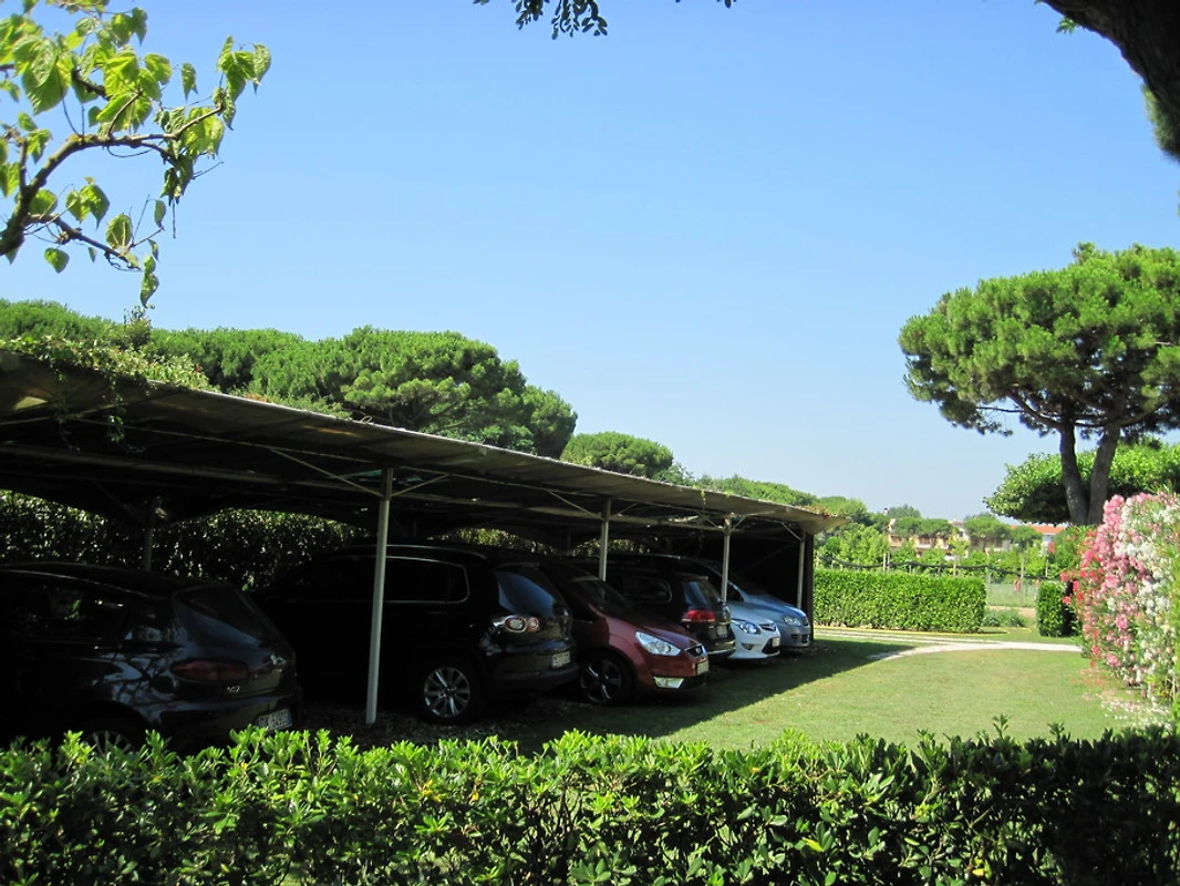 Overdekte parkeerplaats en berging voor fietsen, ligstoelen en parasols.