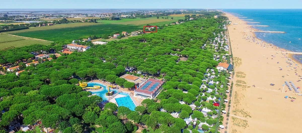 De bungalow ligt in het midden van een smal schiereiland tussen de lagune en de Adriatische Zee, een paar meter van het strand en een half uur van de stad Venetië.