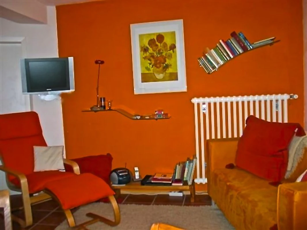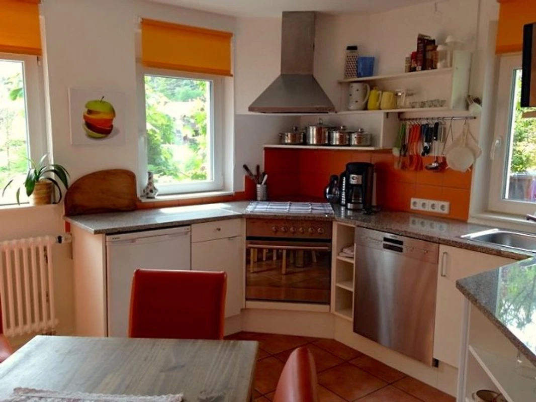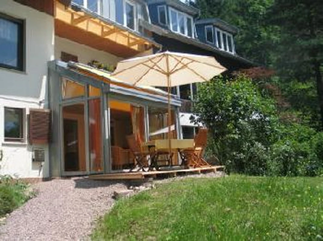 Onze gelijkvloerse flat is een flat met gelijkvloerse ingang, speciaal geschikt voor kinderen of mensen die niet graag trappen lopen. Het bestaat uit een beschut, gezellig interieur, met een verleidelijk grote eet- en speeltafel van massief hout voor 6-8 personen, geïntegreerd in een open keuken! Er is een gezellige open haard en een TV-hoek. Alles is gemakkelijk hanteerbaar en kan desgewenst worden uitgebreid tot een grote serre, die veel licht + zon binnenlaat en een prachtig uitzicht biedt op de natuurlijke omgeving van het Zwarte Woud in het verschiet. Hier is de verbinding tussen "binnen en buiten" bijzonder goed merkbaar!