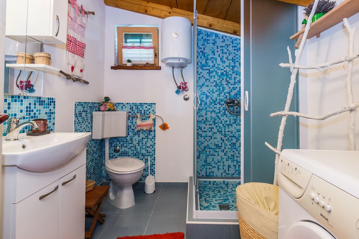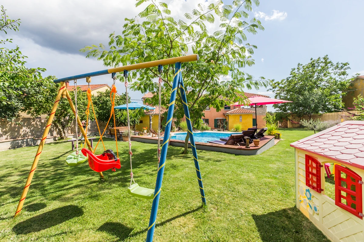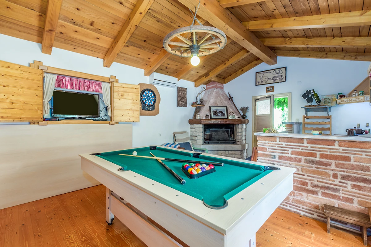 On the first floor there are a large terrace, living room, one double and one twin room with shower/bathroom. The private swimming pool has a hydro-massage area with multicolour lights and it is 30 m2 large. The garden area surrounding the swimming pool stretches to 1000m2 of nice green grass and it is equipped with deck chairs and parasol, made from natural materials. The garden is completely surrounded with hedge and natural rock fence. In the garden is also a barbecue area with dining table situated near a lovely entertainment house of 30m2 where you can enjoy some unforgettable moments with family and friends playing billiard, The villa Loreta is completely air-conditioned and equipped with digital satellite TV, DVD