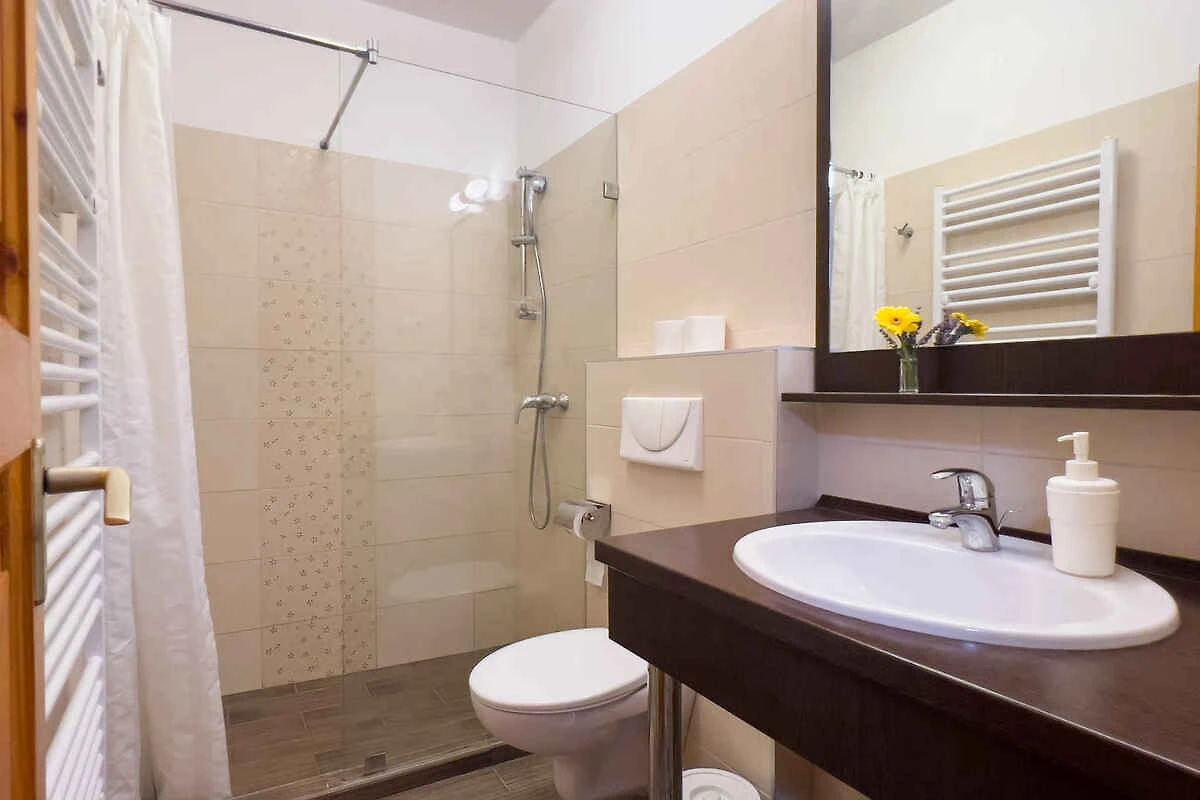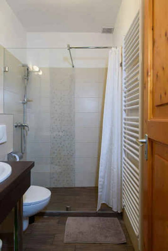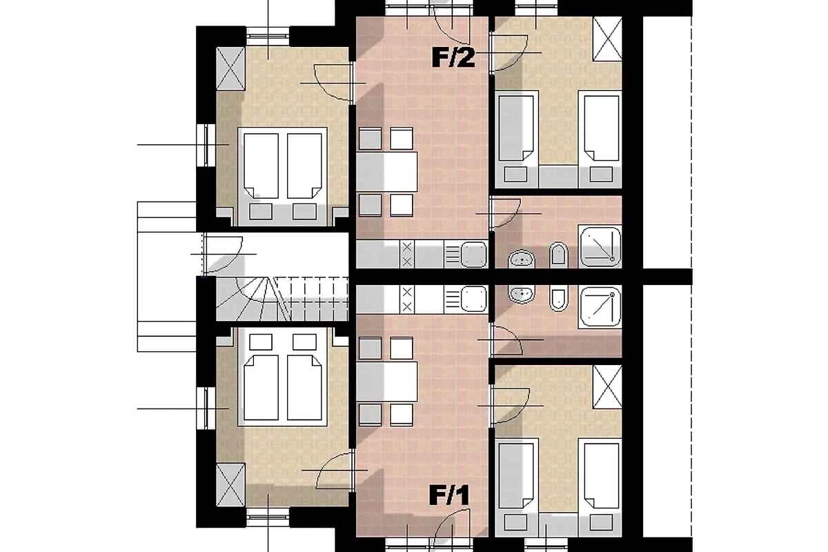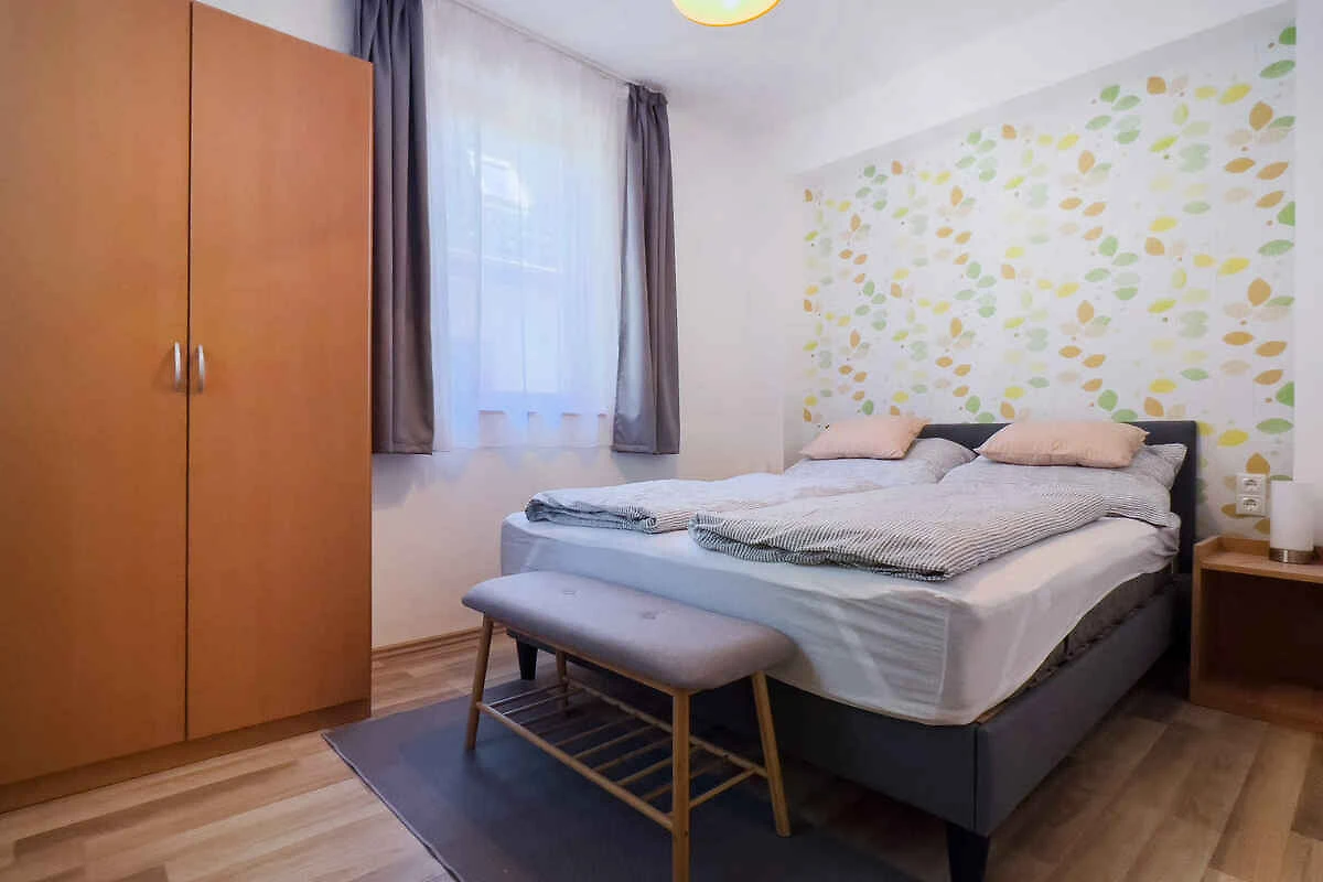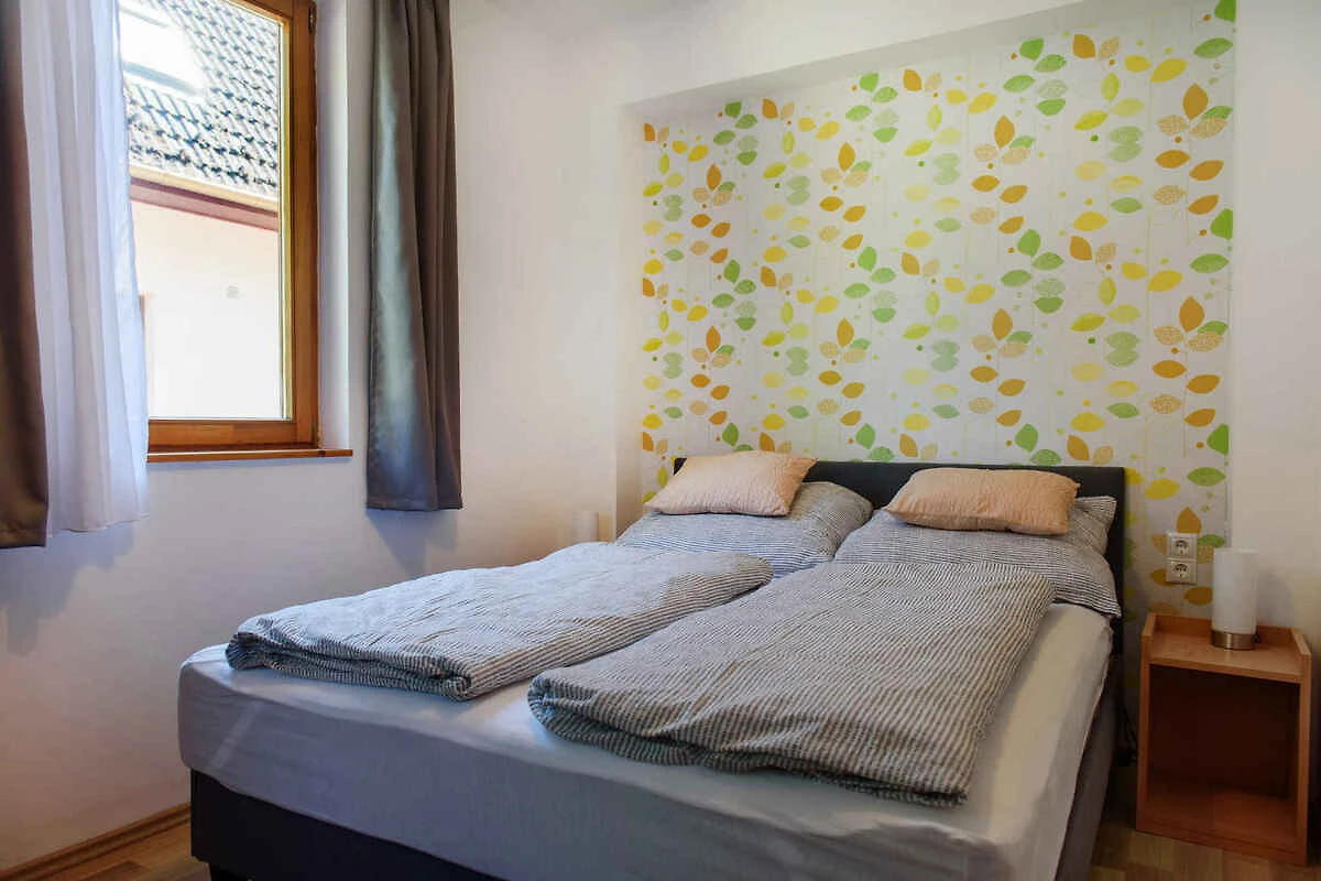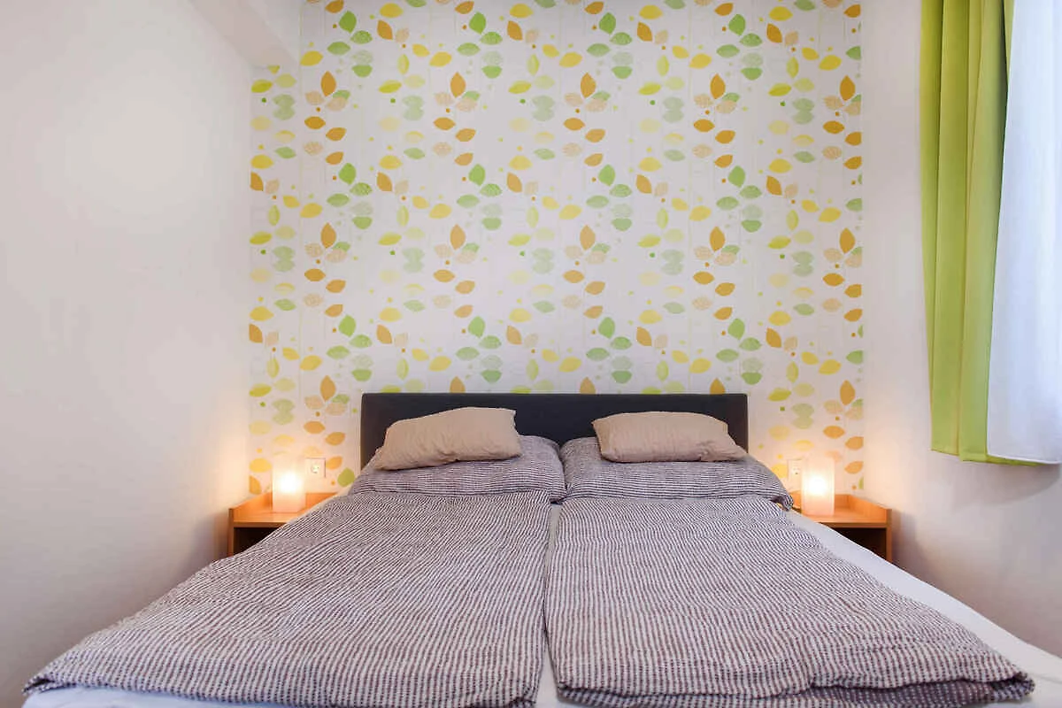 Uw vakantiewoning: Uw vakantiewoning beslaat 1 verdieping, 2 kamers (daarvan 2 slaapkamers), is 40 m² groot en is geschikt voor maximaal 4 personen. Een airconditioning zorgt op hete dagen voor een aangename temperatuur. Op koude dagen kan uw vakantiewoning verwarmd worden met centrale verwarming. De ingang is im Erdgeschoss en gelijkvloers en leidt via de terras direct in de woonkeuken. De indeling van de kamers is als volgt: slaapkamer met 2 éénpersoonsbedden. slaapkamer met 1 tweepersoonsbed. keuken met eethoek, TV, gasfornuis, koelkast (vriesvak), magnetron, koffiemachine en broodrooster. U heeft toegang tot het terras. badkamer met douche, 1 wastafel en WC.