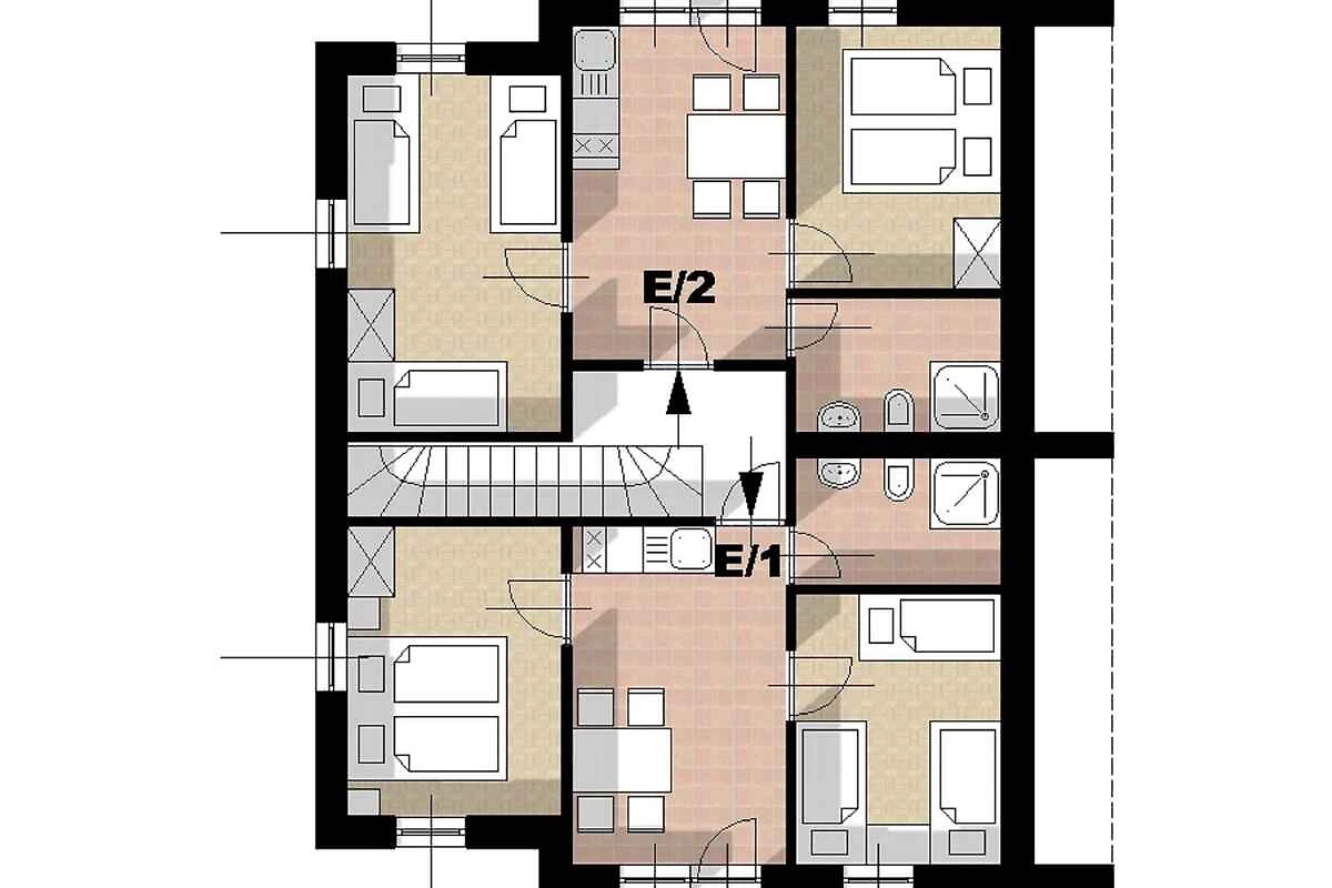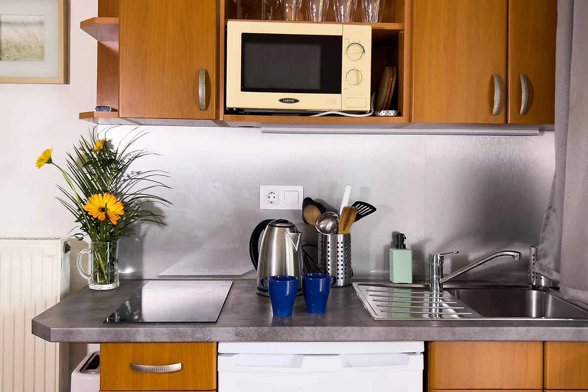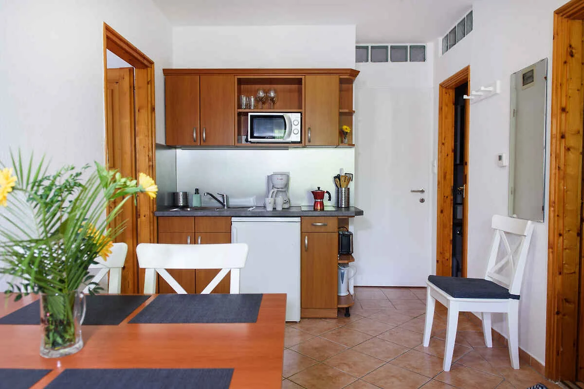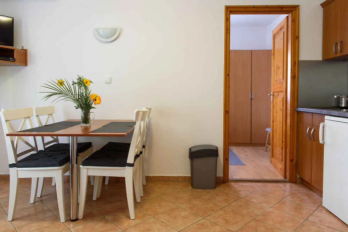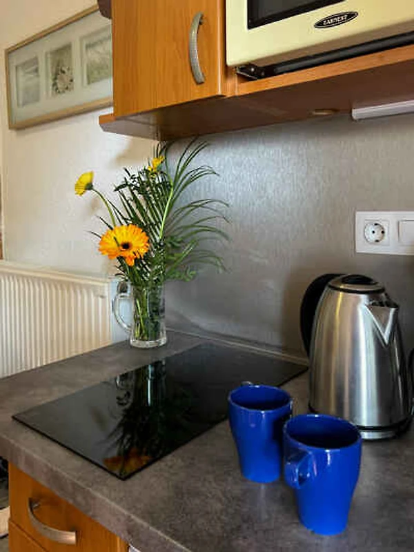 Uw vakantiewoning: Uw vakantiewoning beslaat 1 verdieping, 2 kamers (daarvan 2 slaapkamers), is 40 m² groot en is geschikt voor maximaal 5 personen. Een airconditioning zorgt op hete dagen voor een aangename temperatuur. De ingang is im Erdgeschoss en leidt via een binnentrap. De indeling van de kamers is als volgt: slaapkamer met 2 éénpersoonsbedden. slaapkamer met 3 éénpersoonsbedden. keuken met eethoek, TV, gasfornuis, koelkast (vriesvak), magnetron, koffiemachine en broodrooster. U heeft toegang tot het terras. badkamer met douche, 1 wastafel en WC.