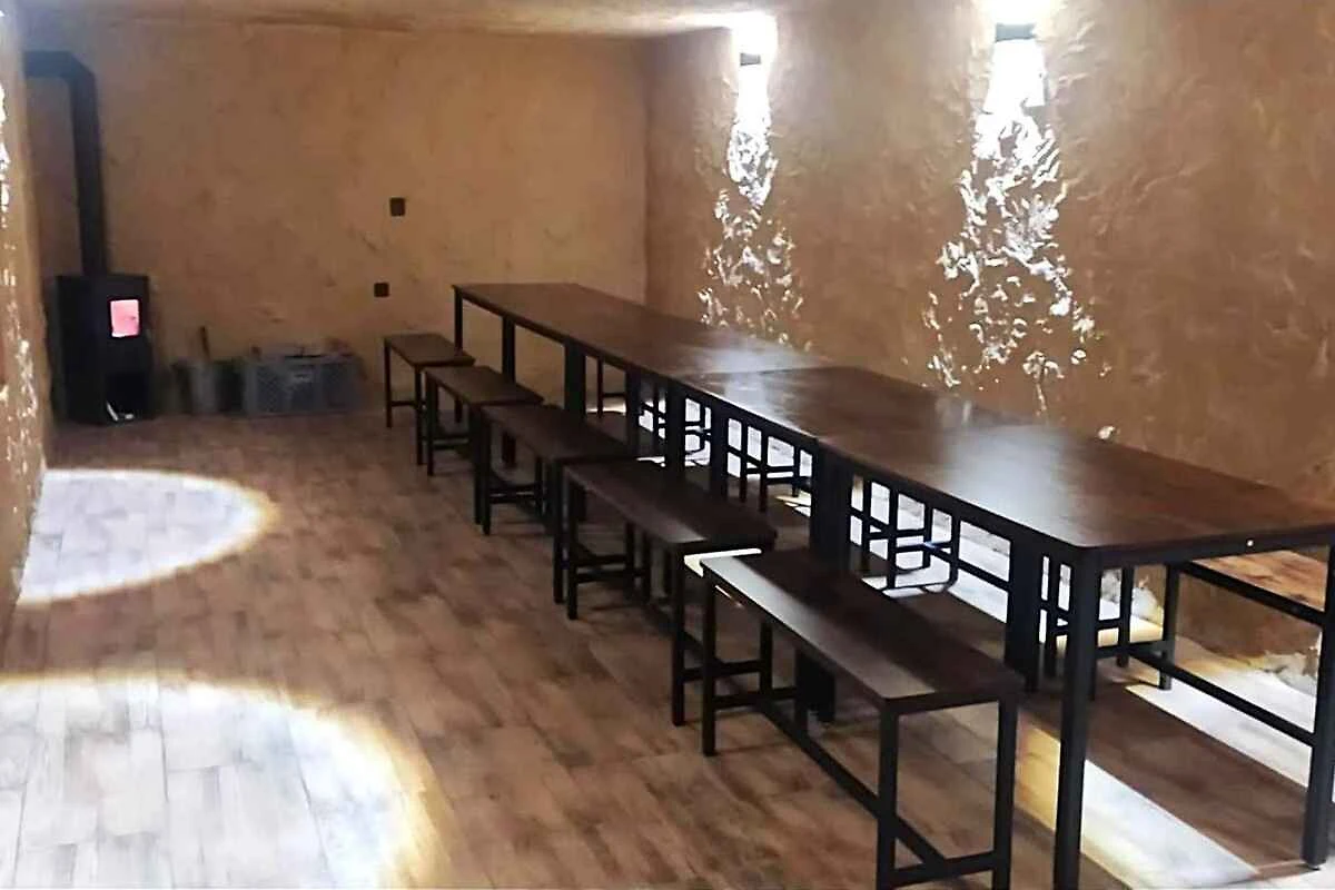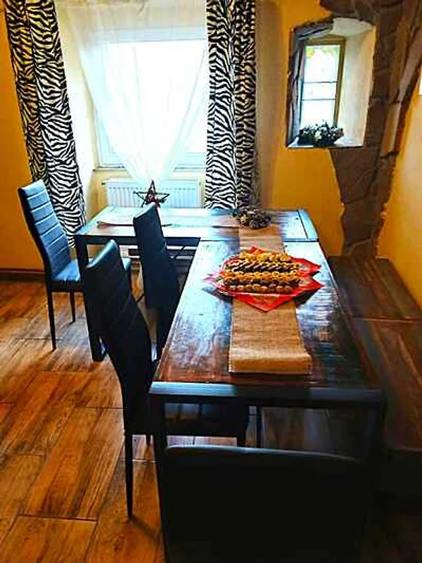 souterrein: recreatieruimte als doorgangskamer, 40 m² groot en met haard, eethoek en Místnost určená k zábavě celé skupiny s možností vstupu do zahrady a na krytou terásku pro kuřáky. Centrální vytápění plus krbová kamna, posezení za 20 osob, lze rozšířit, prostor pro tanec. Dostupná z kuchyně objektu po schodech do suterénu. De eethoek heeft plaats voor 20 personen. U heeft toegang tot het terras.
