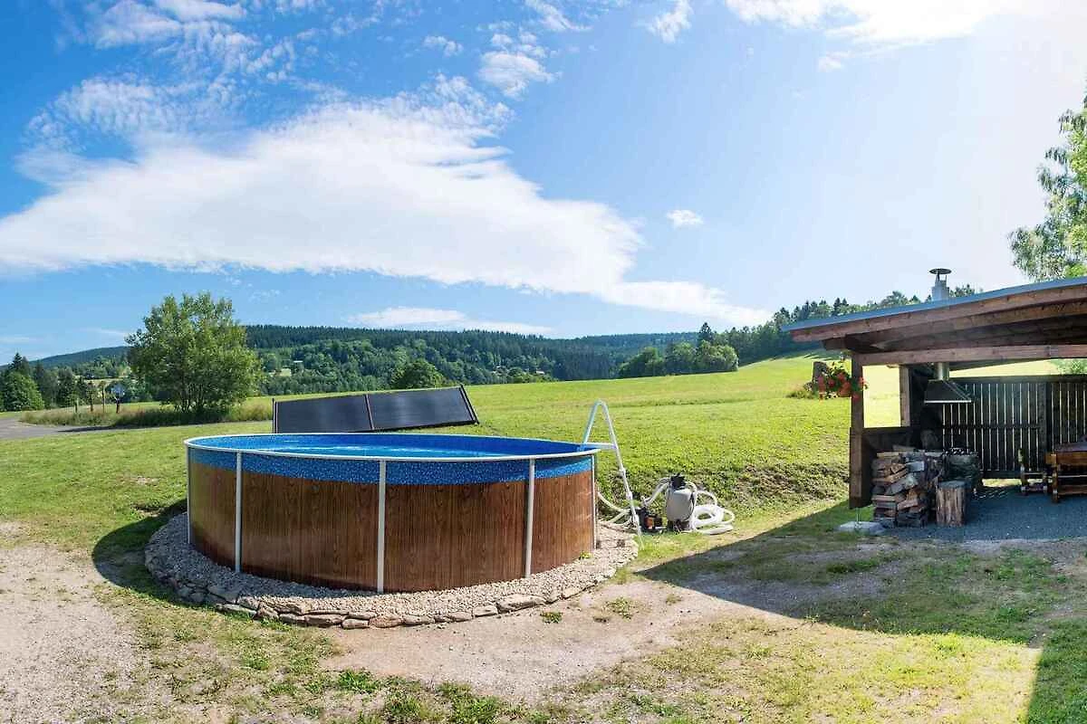 Het vakantiehuis ligt op een 1000 m² groot, open terrein met tuin met weide. De verhuurder woont niet in het huis of op het terrein. De inrichting is voor u privé gebruik beschikbaar. U kunt buiten relaxen met paviljoen en tuinmeubeklen. De speelplaats met schommel laat kinderharten sneller slaan. Een barbecue is aanwezig. Romantische avonden belooft de kampvuurplaats. Het privé te gebruiken zwembad is van begin juli t/m eind augustus te gebruiken en heeft een buitenzwembad (doorsnee 5,5 m, diepte 1,20 m).