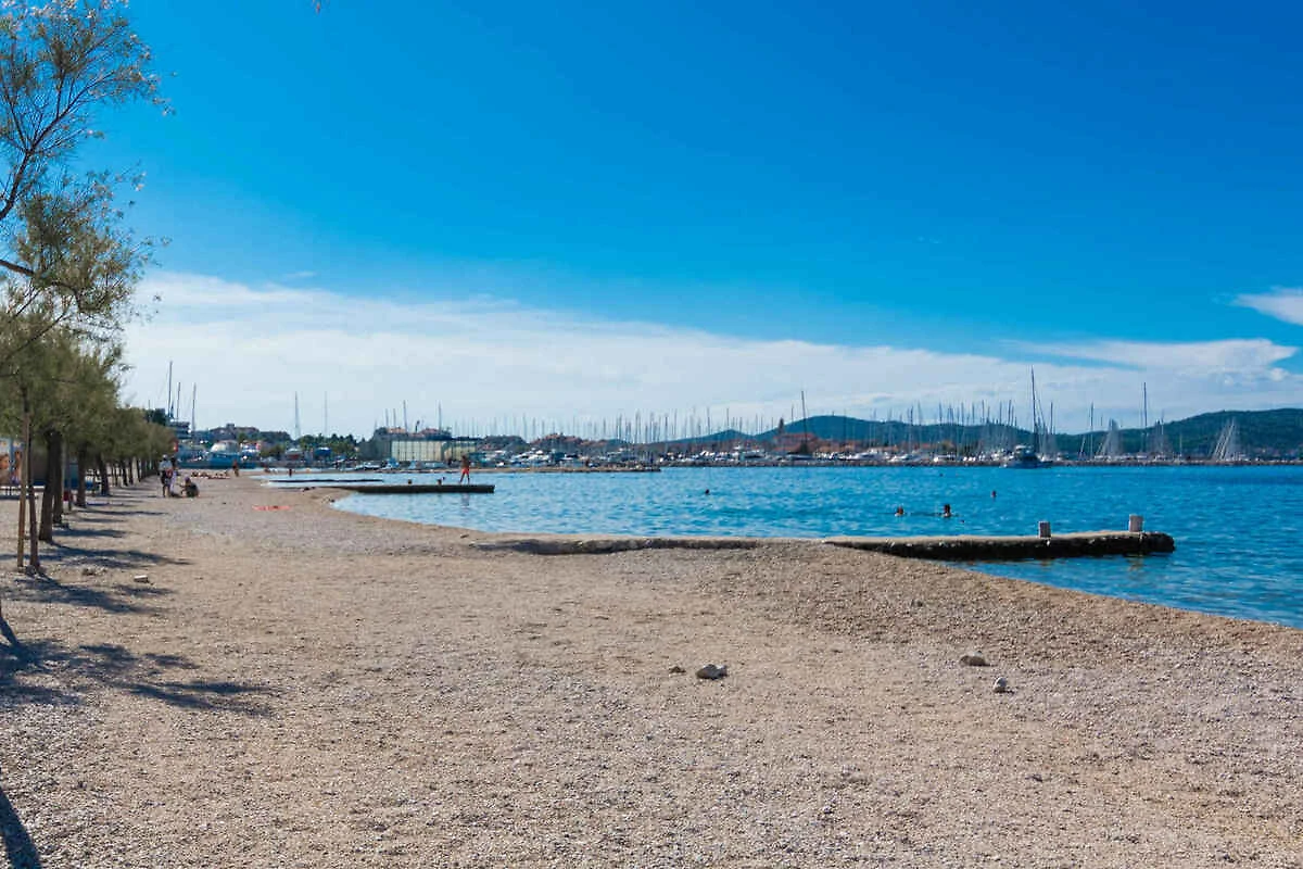 In de zomer: Adriatische Zee in Biograd na Moru 80 m, strand met kiezel.