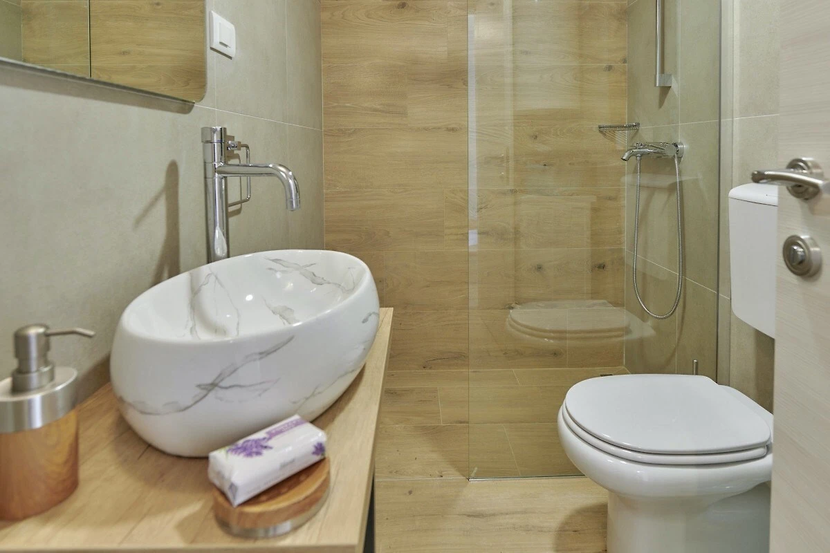 Uw vakantiewoning: Uw vakantiewoning beslaat 3 verdiepingen, 2 kamers (daarvan 1 slaapkamer), is 65 m² groot en is geschikt voor maximaal 4 personen. Een airconditioning zorgt op hete dagen voor een aangename temperatuur. De ingang is gelijkvloers. De indeling van de kamers is als volgt: woonkamer met 1 extra bed op slaapbank en eethoek. U heeft toegang tot het 10 m² grote, overdekt terras met tuinmeubelen. slaapkamer met 1 tweepersoonsbed en 1 éénpersoonsbed. kookhoek in de woonkamer met eethoek, gasfornuis, elektrisch fornuis (4 kookplaat), bakoven, koelkast (10 l, vriesvak), koffiemachine en elektrische waterkoker. De eethoek heeft plaats voor 4 personen. badkamer met douche, 1 wastafel en WC.