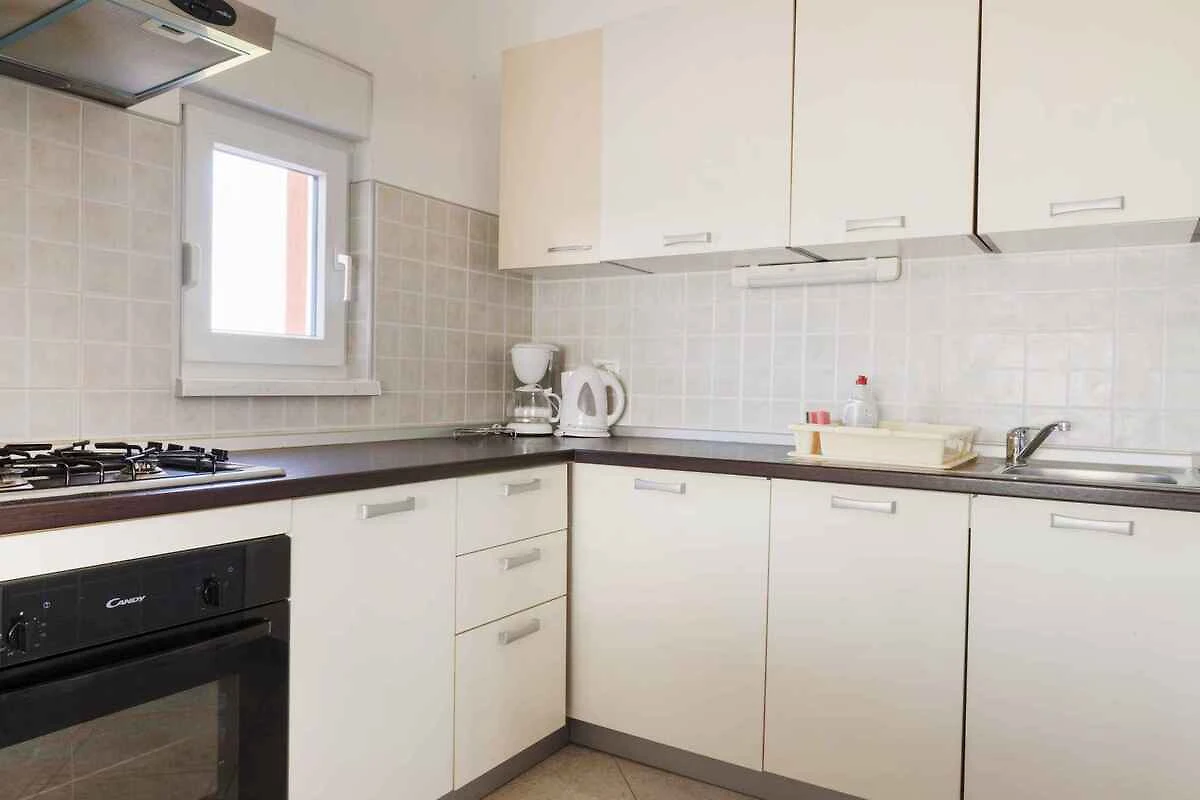 Ligging: Pula, 15 m boven de zeespiegel. De vakantiewoning ligt in een in 2007 gebouwde appartementenhuis, is in het jaar 2007 gerenoveerd en is modern, functioneel en in lokale stijl ingericht. Het grondstuk is aan de rand van de plaats. Deze plaats is populair vanwege het ligt op een rustige en zonnige plek. De 10 m lange toegangsweg naar het terrein gaat via een geasfalteerde hoofdweg. Bij het huis zijn U 10 parkeerplaatsen voor meerdere auto's op het perceel beschikbaar. Openbare parkeerplaatsen zijn op een 10 m afstand parkeerplaats in de plaats. De lengte van de toegang is 30 m. De dichtsbijzijnde winkels zijn op 2 km afstand, restaurant 800 m en centrum 3 km. De plaats Fažana (het Nationale Park Brijuni) 3,5 km.
