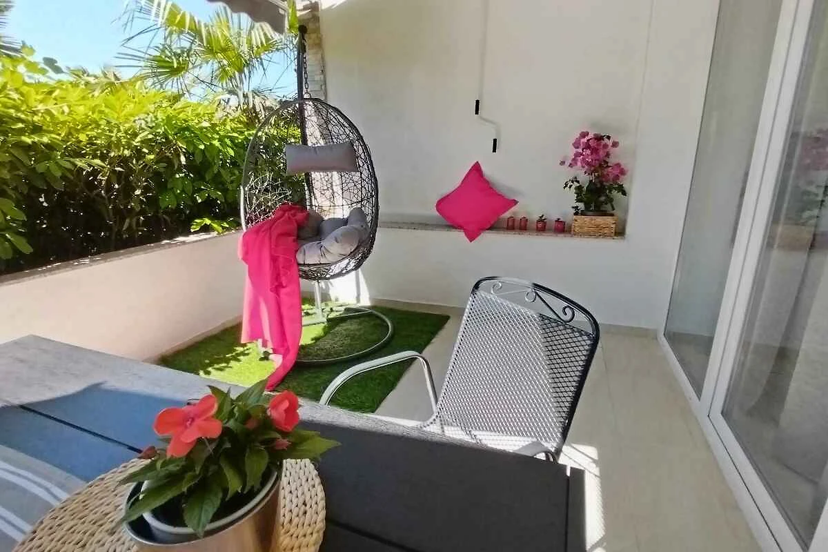 Uw vakantiewoning: Uw vakantiewoning beslaat 1 verdieping, 2 kamers (daarvan 1 slaapkamer), is 50 m² groot en is geschikt voor maximaal 2 personen. Een airconditioning zorgt op hete dagen voor een aangename temperatuur. Er is geen verwarming. Roken is binnen niet toegestaan. De ingang is gelijkvloers en leidt via de 15 m² groot terras direct in de woonkamer. De indeling van de kamers is als volgt: woonkamer 25 m² groot, onverwarmd en met TV. U heeft toegang tot het 15 m² grote, overdekt terras met 1 tafel en 4 stoelen. slaapkamer 15 m² groot, onverwarmd en met 1 tweepersoonsbed. U heeft toegang tot het 15 m² grote, overdekt terras met 1 tafel en 4 stoelen. keuken 15 m² groot en met eethoek, afwasmachine, elektrisch fornuis (4 kookplaat), bakoven, koelkast, magnetron, koffiemachine en elektrische waterkoker. De eethoek heeft plaats voor 4 personen. badkamer 10 m² groot, onverwarmd en met douche, 2 wastafels en WC.