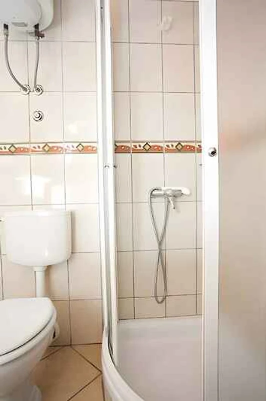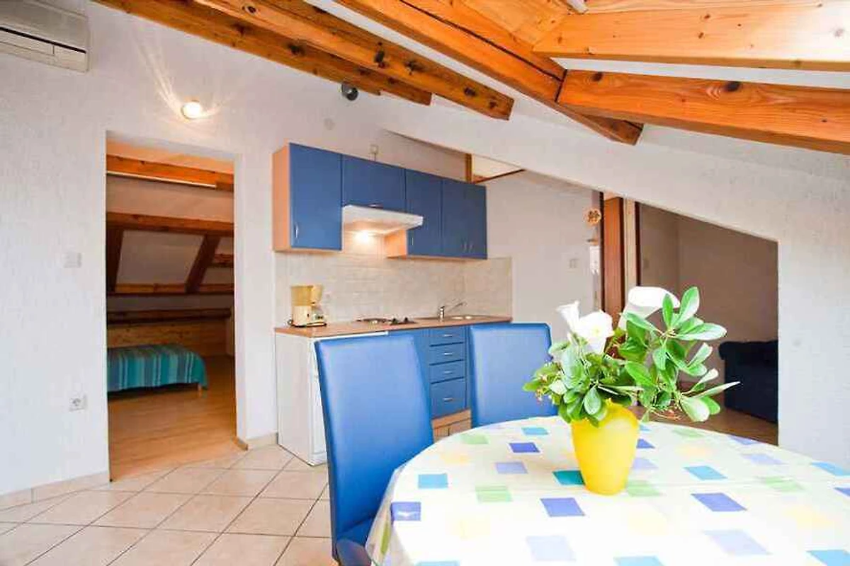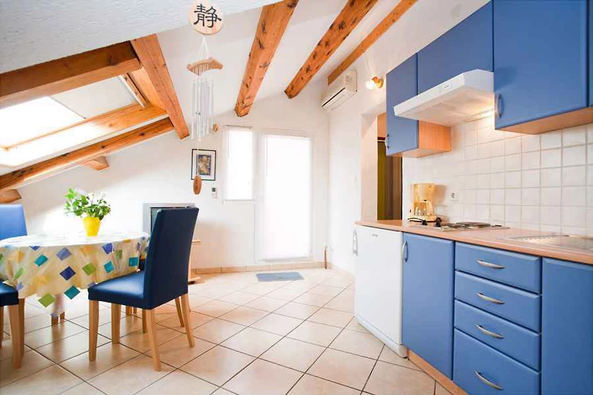 Uw vakantiewoning: Uw vakantiewoning beslaat 1 verdieping, 3 kamers (daarvan 2 slaapkamers), is 50 m² groot en is geschikt voor maximaal 4 personen. Een airconditioning zorgt op hete dagen voor een aangename temperatuur. De ingang is op de zolderverdieping en leidt via een binnentrap direct in de woon/slaapkamer. De indeling van de kamers is als volgt: woon/slaapkamer als doorgangskamer, 35 m² groot en met 1 tweepersoonsbed, zithoek, eethoek en TV. De eethoek heeft plaats voor 4 personen. U heeft toegang tot het 20 m² grote balkon met tuinmeubelen. slaapkamer slaapkamer 9 m² groot en met 1 tweepersoonsbed. kookhoek met elektrisch fornuis (2 kookplaat), koelkast (vriesvak) en koffiemachine. badkamer met douche, WC en venster.