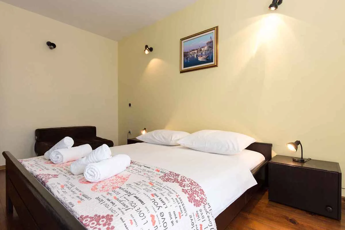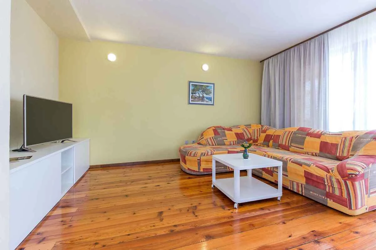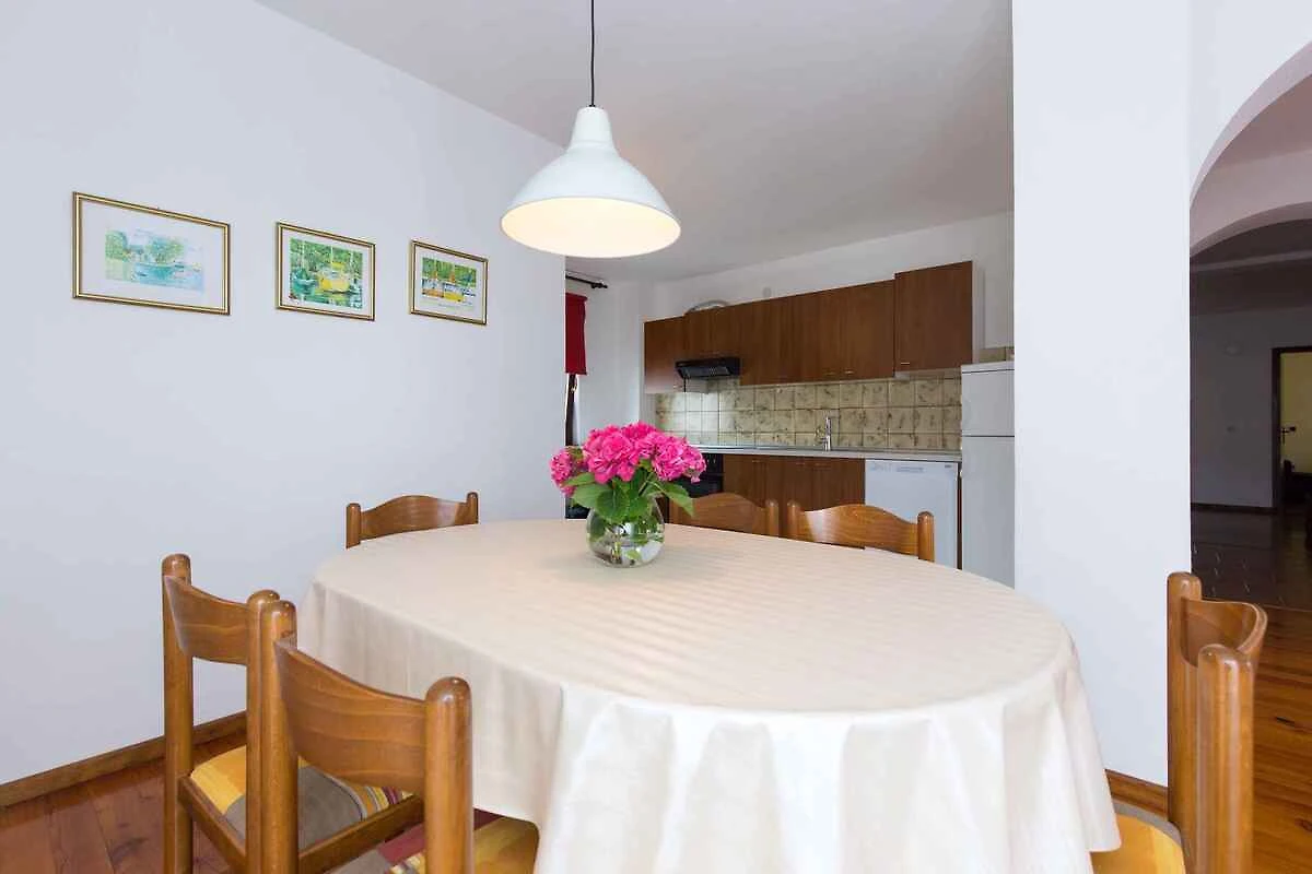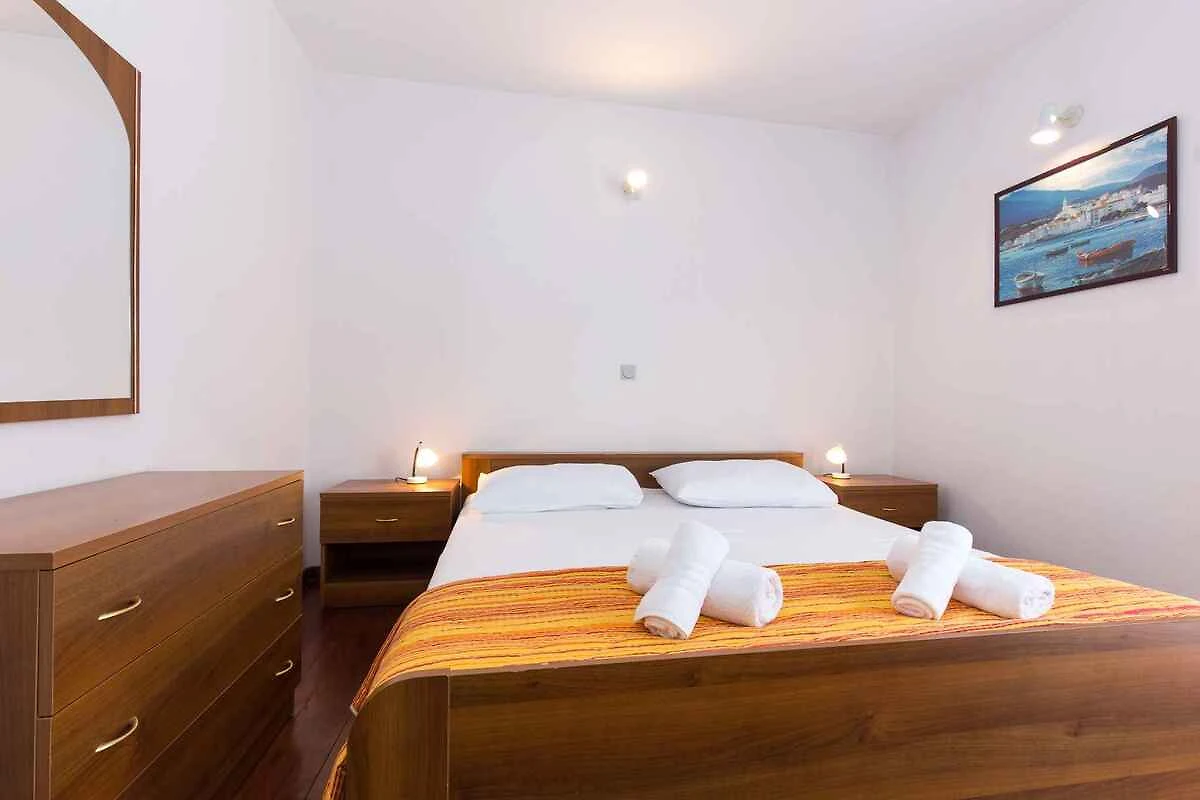 Ligging: Punat. De vakantiewoning ligt in een vrijstaand éénsgezinswoning, is in het jaar 2005 gerenoveerd en is functioneel ingericht. Het grondstuk is in een drukke omgeving in een woongebied in het centrum. Deze plaats is populair vanwege het uitzicht op de zee. Op de begane grond is het restaurant / pizzeria "Zoals Janos". De toegangsweg naar het terrein gaat via een geasfalteerde zijstraat. Bij het huis zijn U 3 parkeerplaatsen voor meerdere auto's op het perceel beschikbaar. De dichtsbijzijnde winkels zijn op 150 m afstand, restaurant 1 m en centrum 150 m. vliegveld in Omišalj 30 km. apotheek, bank elk 500 m in Punat. station in Rivier 65 km.