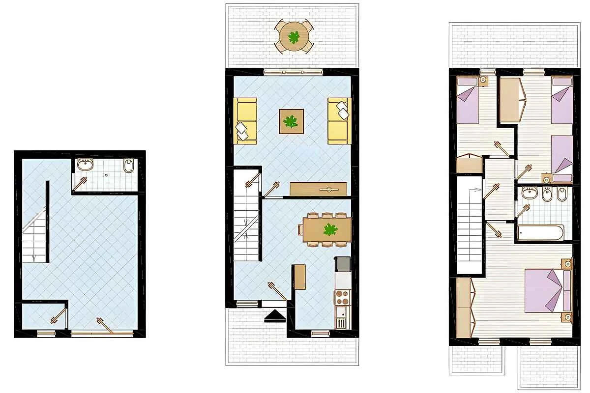 Uw vakantiewoning: Uw vakantiewoning beslaat 3 verdiepingen, 4 kamers (daarvan 3 slaapkamers), is 75 m² groot en is geschikt voor maximaal 8 personen. Een airconditioning zorgt op hete dagen voor een aangename temperatuur. Op koude dagen kan uw vakantiewoning verwarmd worden met centrale verwarming. De indeling van de kamers is als volgt: