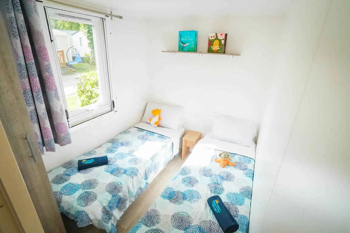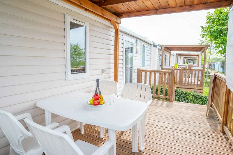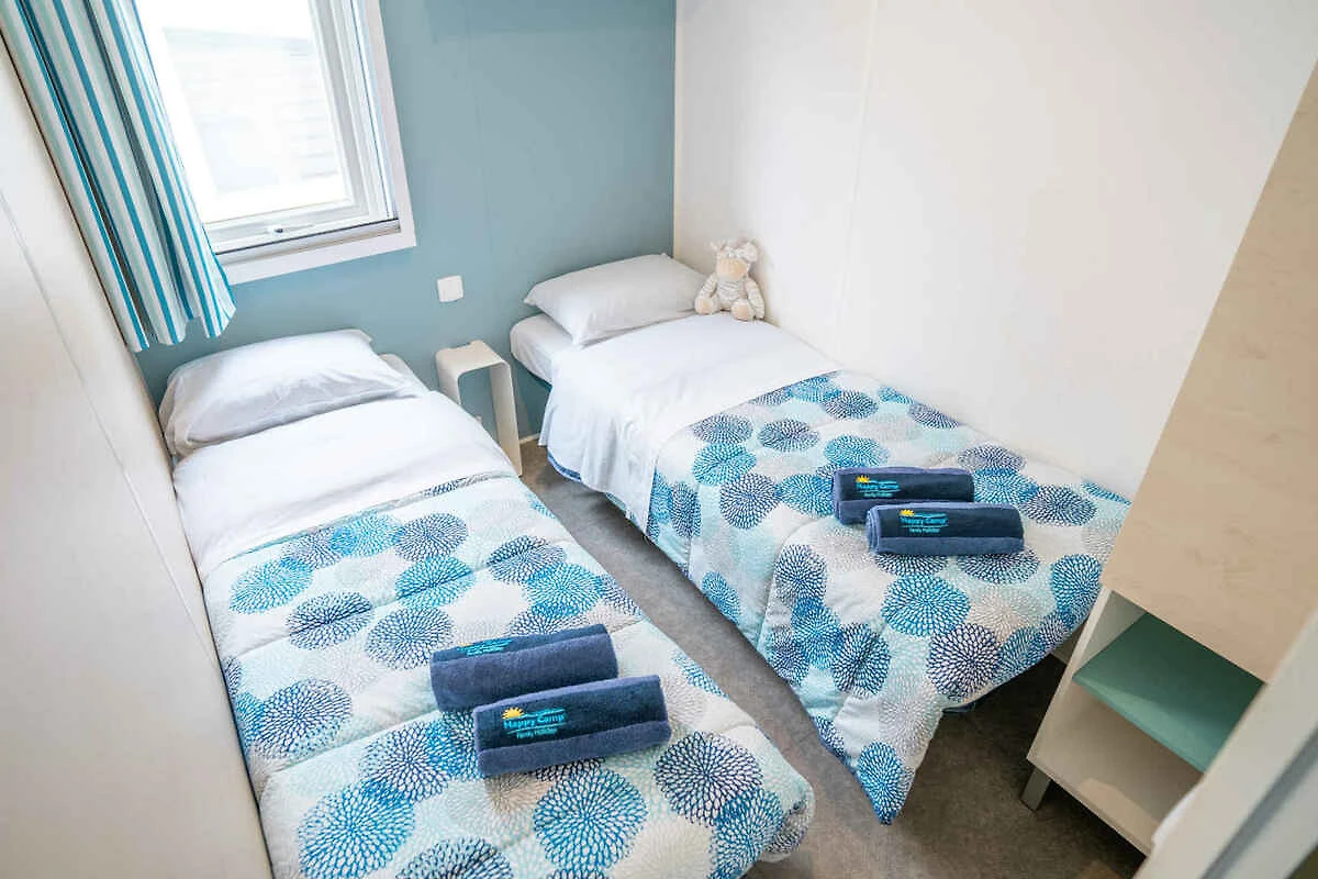 Uw stacaravan: Uw stacaravan heeft 1 verdieping, 4 kamers (daarvan 3 slaapkamers), is 29 m² groot en is geschikt voor maximaal 7 personen. Roken is binnen niet toegestaan. Een airconditioning zorgt op hete dagen voor een aangename temperatuur. De indeling van de kamers is als volgt: woonkamer met 1 extra bed en eethoek. U heeft toegang tot het terras met tuinmeubelen. slaapkamer met 1 tweepersoonsbed. slaapkamer met 2 éénpersoonsbedden. slaapkamer met 2 éénpersoonsbedden. kookhoek in de woonkamer met gasfornuis (4 pitten) en koelkast (vriesvak). badkamer met douche, 1 wastafel en WC.