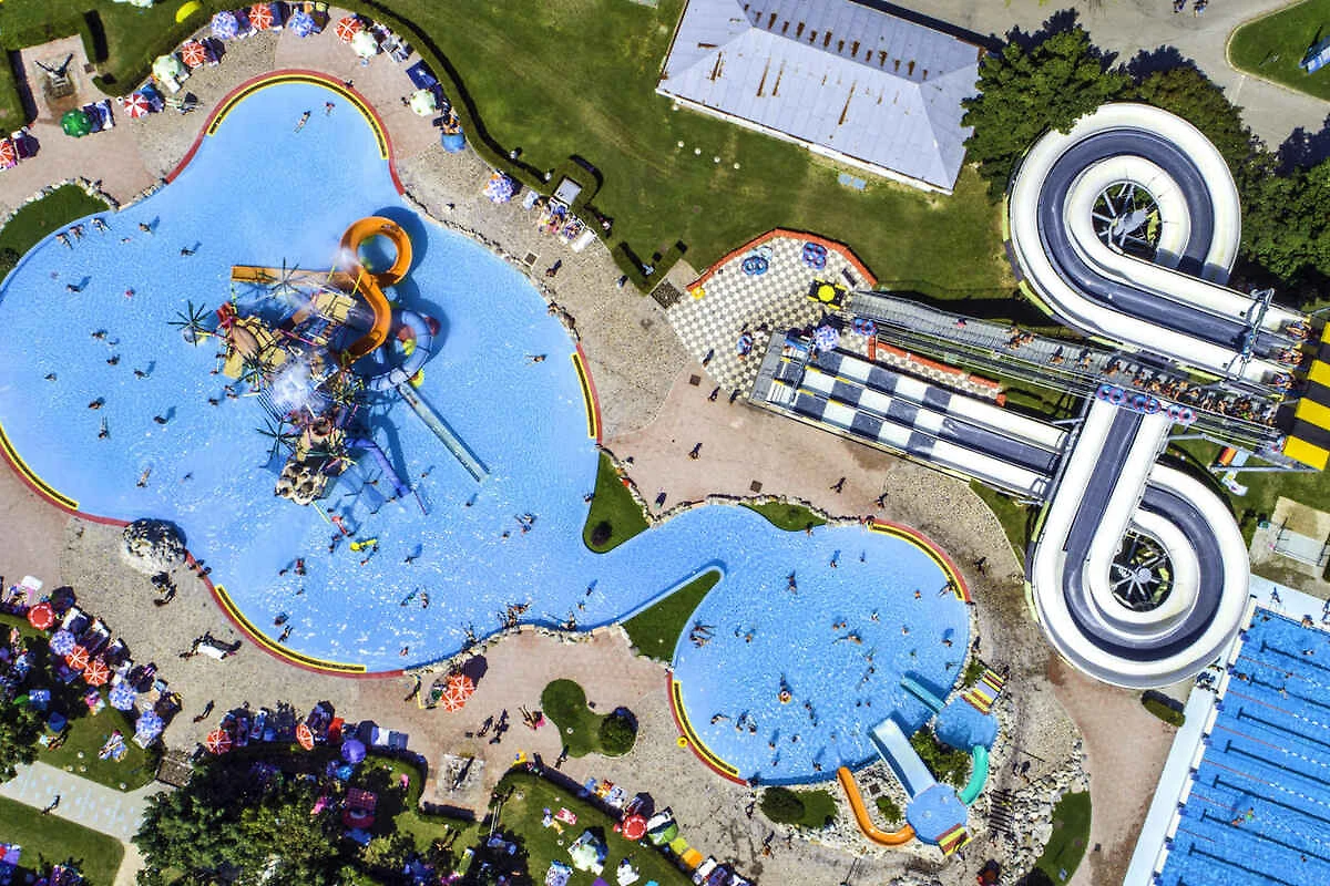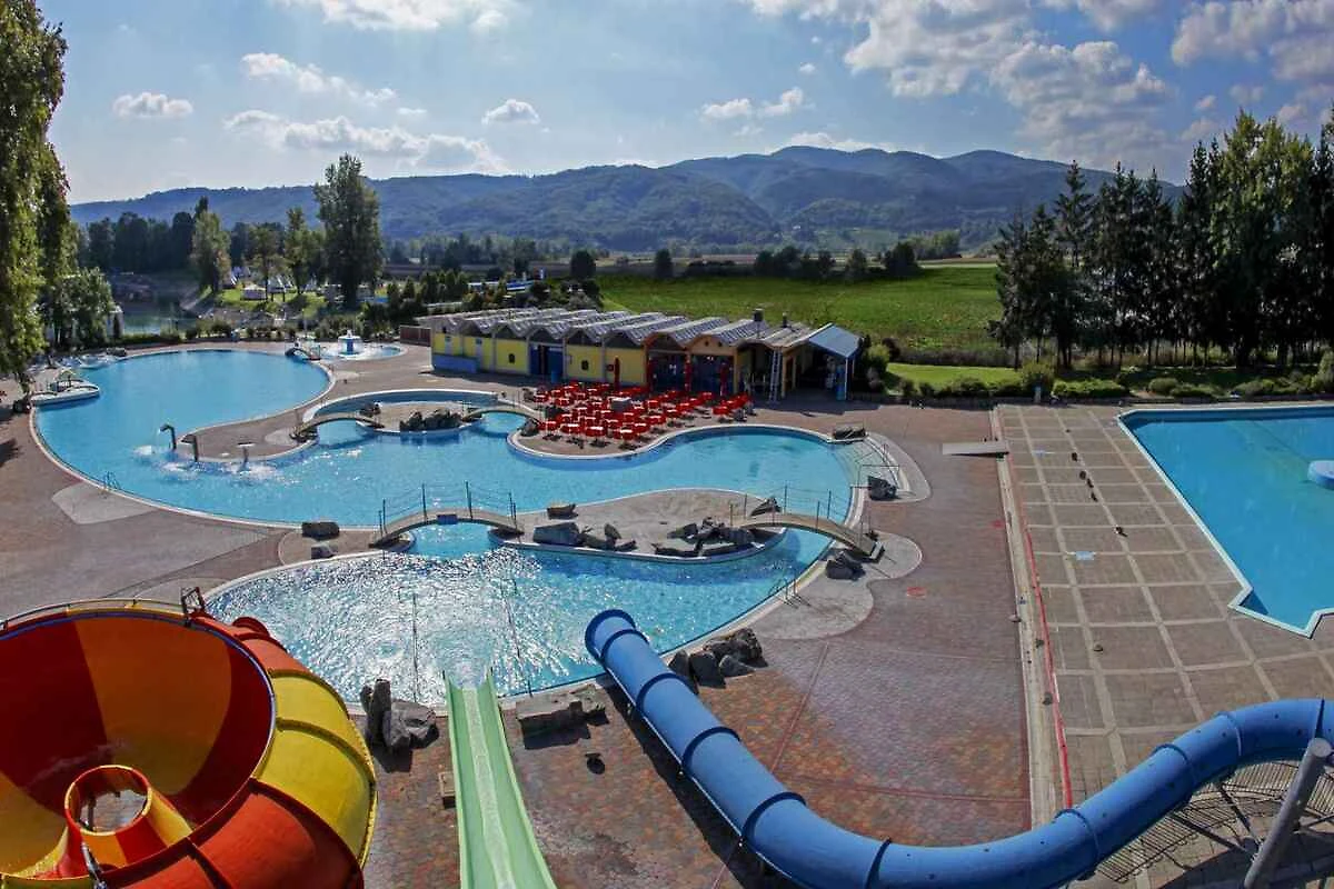 De stacaravan ligt op een camping. de Het park heeft receptie, geldautomaat, 1 restaurant, supermarkt, kiosk, wassalon, pizzeria, bar, terras, tuinmeubelen en grillmogelijkheid. Voor vermaak zorgt het animatieprogramma voor kinderanimatie en volwassene. voor gemeenschappelijk gebruik Zwembad en kinder zwembad. Binnen zwembad. Het dorp biedt twee aparte thermale parken om het hele jaar door plezier te garanderen. De Zomerthermaalriviera heeft een oppervlakte van 10.000 vierkante meter thermaal water en biedt een verscheidenheid aan zwembaden in verschillende vormen en maten, geschikt voor zowel volwassenen als kinderen. De belangrijkste attracties zijn waterglijbanen, een pirateneiland, een stroomkanaal, golfslagbaden en whirlpools, perfect om te ontspannen in de zon. De Winterthermaalriviera, met 2300 m² verwarmd thermaal water, is ideaal voor wellnessvakanties het hele jaar door en biedt binnen- en buitenzwembaden, glijbanen en andere attracties voor jong en oud.