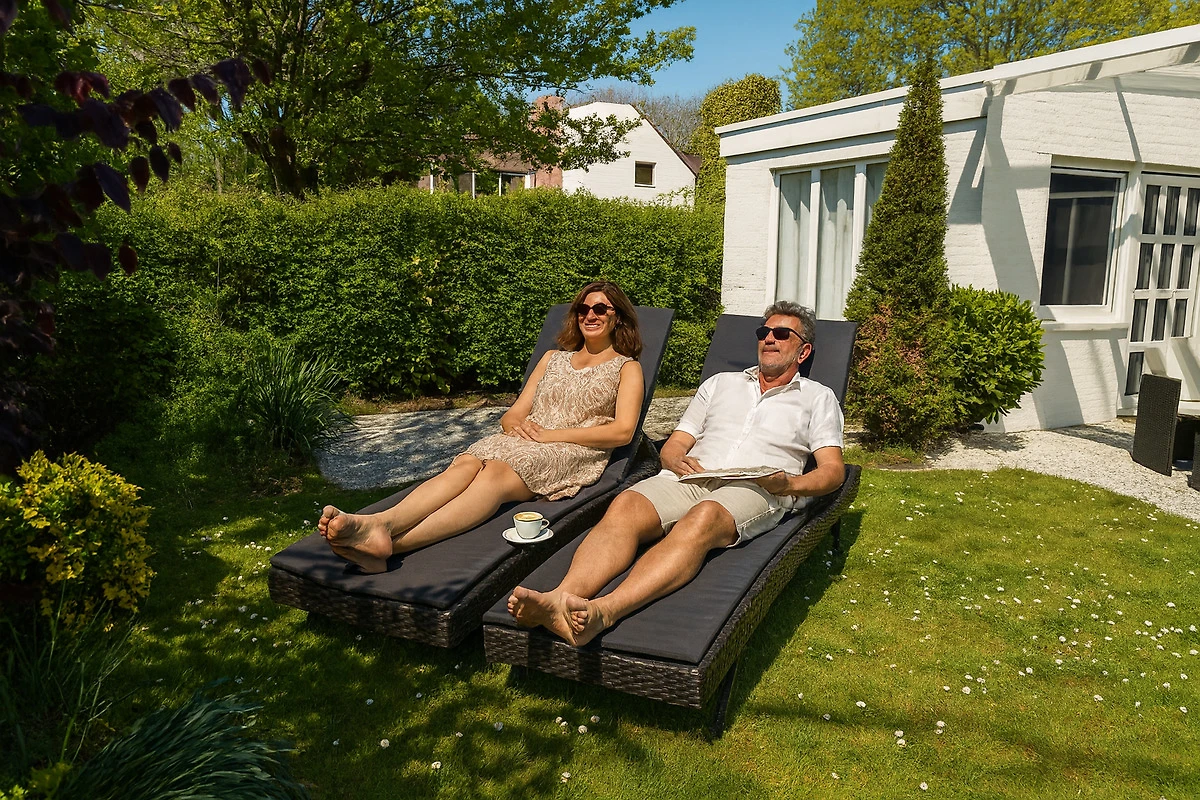Voor extra ontspanning zorgt het aparte bijgebouw met infraroodsauna, rustruimte en extra terras. Of het nu gaat om een saunabezoek na een dag op het strand, een haardvuur in de winter of een glas wijn met uitzicht op het groen – hier is ontspanning gegarandeerd.