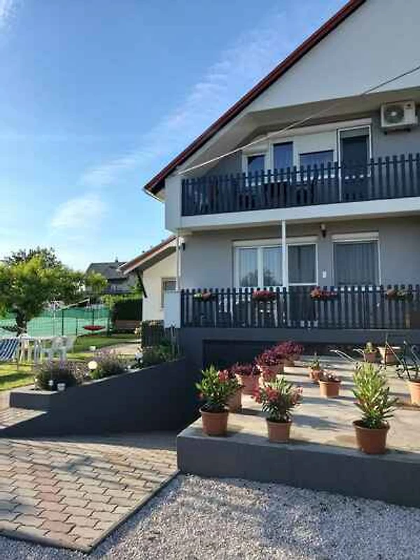 Ligging: Gyenesdiás. De vakantiewoning ligt in een dubbelhuis, is in het jaar 2023 gerenoveerd en is modern ingericht. Het grondstuk is in een vakantiehuis-gebied. Deze plaats is populair vanwege het ligt op een rustige en zonnige plek. De toegangsweg naar het terrein gaat via een geasfalteerde zijstraat. Bij het huis zijn U 4 parkeerplaatsen voor meerdere auto's op het perceel beschikbaar. De dichtsbijzijnde winkels zijn op 200 m afstand, restaurant 200 m en centrum 200 m. Gyenesdiás: sauna, bank elk 1000 m. bioscoop 1500 m en apotheek 500 m. thermaal bad in Hévíz 6 km. dokter in keszthely 300 m. Keszthely: station, discotheek elk 3 km. overdekt zwembad 4 km. Een kinderspeelplaats op 50 m afstand. spoorlijn 1500 m. Fietsverhuur ongeveer 50 m in Tourinform office.