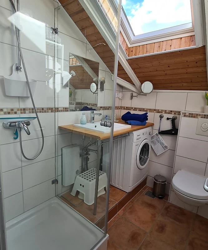 De wasmachine bevindt zich ook in de lichte doucheruimte met dakraam. Handdoeken en badmatten liggen voor u klaar.