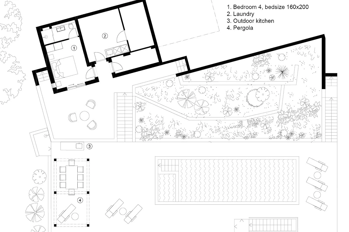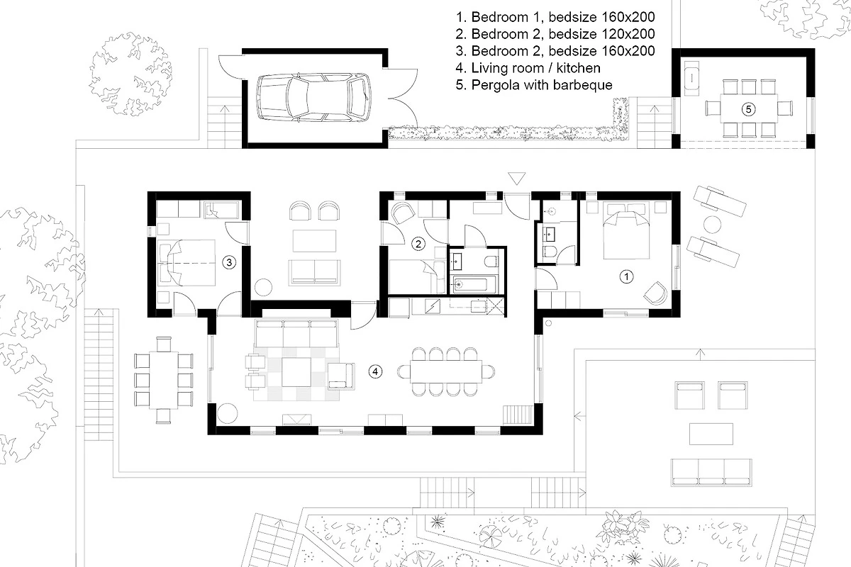Woonkeuken, 2 tweepersoonskamers, 1 eenpersoonskamer, 2 badkamers, 3 terrassen met verschillende eet- en loungegedeeltes, overdekte barbecuezone met Weber-gasbarbecue, parkeerplaatsen, tuin, olijfgaard