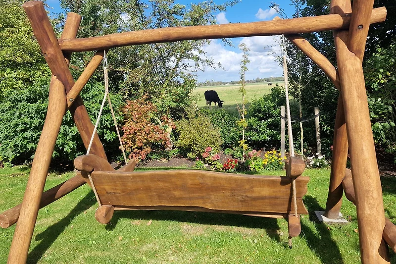 Uw eigen perceel: Het vakantiehuis strekt zich uit over een royaal eigen perceel. Hier heeft u ruimte voor ontplooiing en ontspanning. Nu ook met een nieuwe schommel van natuurhout die uitnodigt om te dromen.