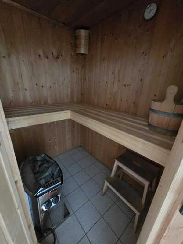 Bij de ingang is er een hal met een badkamer met douche en sauna aan de ene kant en een apart toilet aan de andere kant.
