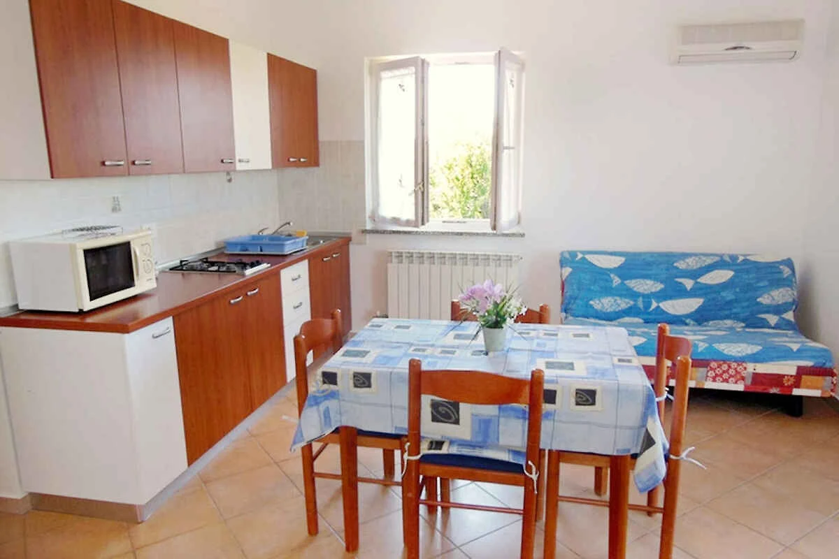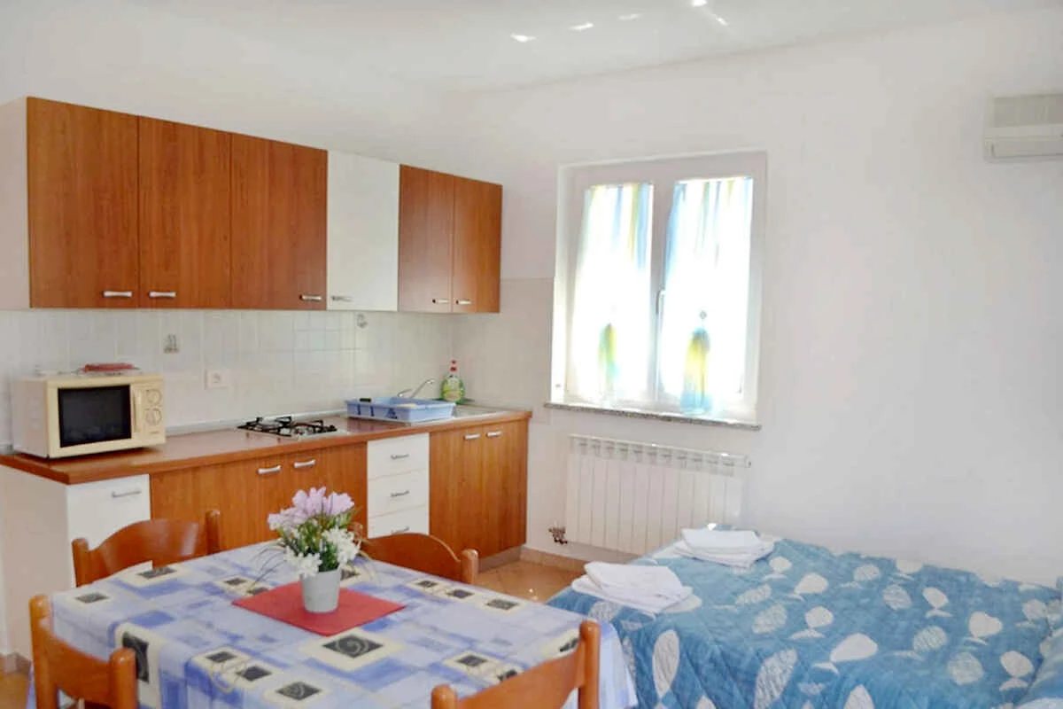 Ligging: Zambratija, wijk Zambratija. De vakantiewoning ligt in een vrijstaand éénsgezinswoning en is functioneel en in lokale stijl ingericht. Het grondstuk is in een woongebied aan de rand van de plaats. Deze plaats is populair vanwege het ligt op een helling op een rustige en zonnige plek. De 2 m lange toegangsweg naar het terrein gaat via een geasfalteerde zijstraat. Bij het huis zijn U 4 parkeerplaatsen voor meerdere auto's op het perceel beschikbaar. Openbare parkeerplaatsen zijn op de straat voor het huis. De dichtsbijzijnde winkels zijn op 400 m afstand, restaurant 400 m en centrum 600 m. bank in Bašanija 600 m. overdekt zwembad, sauna elk 1500 m in Hotel Istra. dokter in Katoro 1500 m. station in Kopar 30 km. apotheek in Umag 4,6 km.