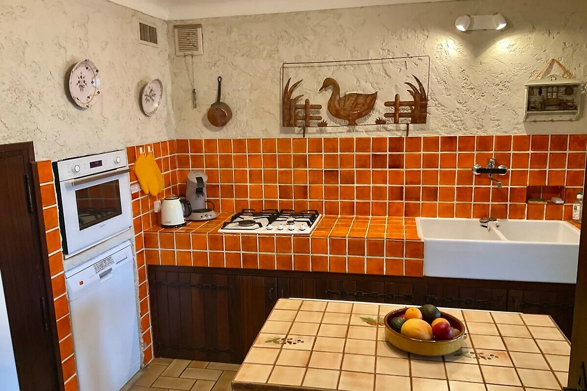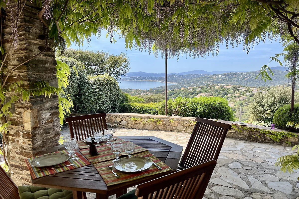 voor de keuken bevindt zich een pergola onder de blauwe regen, waar u kunt genieten van uw maaltijden op het terras met uitzicht op zee. het terras is voorzien van tuinstoelen, ligstoelen en rond het zwembad van de Bains de soleil.