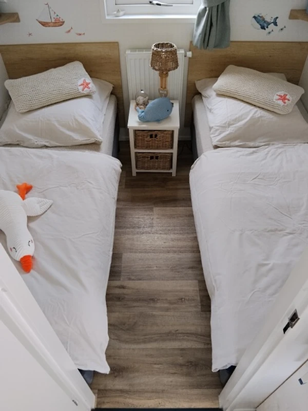 In de slaapkamers staan boxspringbedden: een slaapkamer met een tweepersoonsbed van 160x200 cm en een slaapkamer met twee eenpersoonsbedden van elk 80x200 cm.