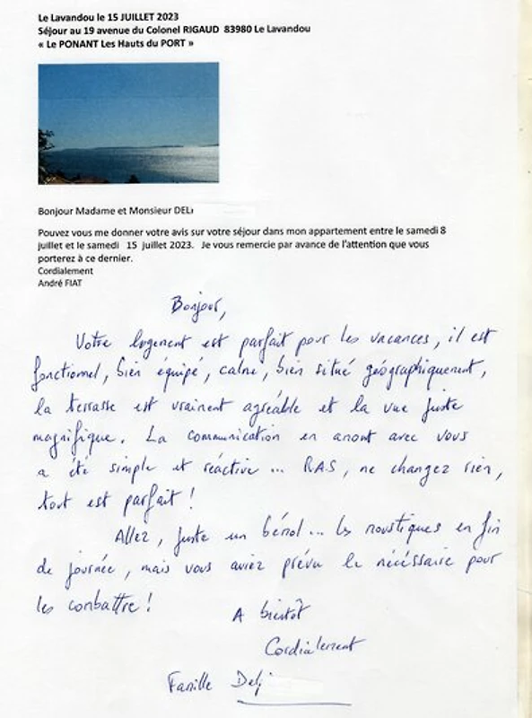 We waren al twee keer in dit zeer mooie vakantieappartement. Voldoende ruimte voor een gezin van 4 personen, de stad en het prachtige strand zijn allemaal zeer goed te voet in een paar minuten te bereiken. Parkeerplaatsen zijn er op de straat direct voor het huis. Prachtig uitzicht op zee vanuit de slaapkamers en van het ruime terras. Het appartement is zeer schoon en heeft alle noodzakelijke dingen. Het terras is uitgerust met voldoende zitplaatsen, een parasol en een barbecuehoek en nodigt uit om te blijven hangen. De verhuurder is zeer vriendelijk, altijd bereikbaar en zeer flexibel wat betreft de tijden voor aankomst en vertrek. We hebben ons erg op ons gemak gevoeld en komen graag weer terug.