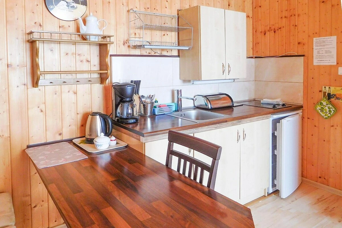 Parterre: (open keuken(kookplaat(2 kookplaten, elektrisch), waterkoker, koffiezetapparaat, koel-/vriescombinatie), woon/slaapkamer(2-pers. slaapbank, TV(duitse zender(s)), eettafel(4 personen)), slaapkamer(2-pers. bed), slaapkamer(2-pers. bed), badkamer(douche, wastafel, toilet))