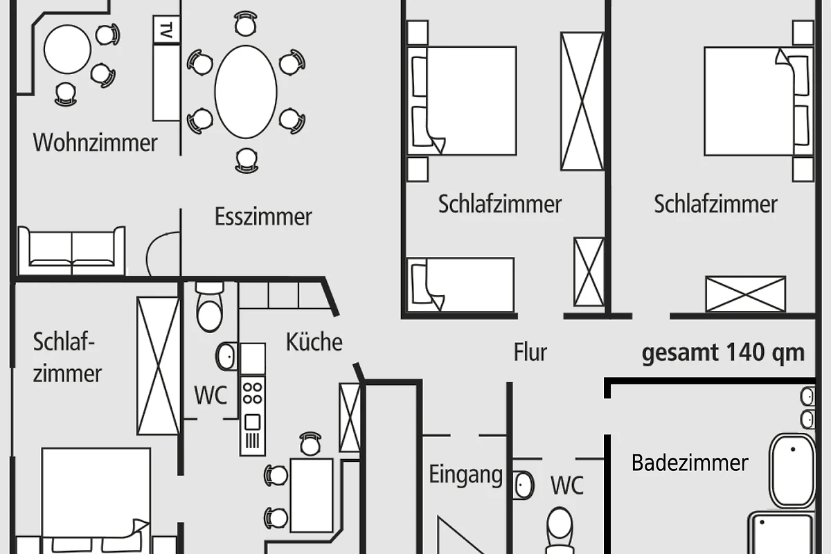 6 kamer vakantiewoning op de begane grond met 2 tweepersoonskamers, een 4-persoonskamer en een uitschuifbare slaapbank in de Walser boerenstube. Volledig uitgeruste keuken. Eethoek met uitgang naar het terras. Badkamer met douche en bad, 2 aparte toiletten.