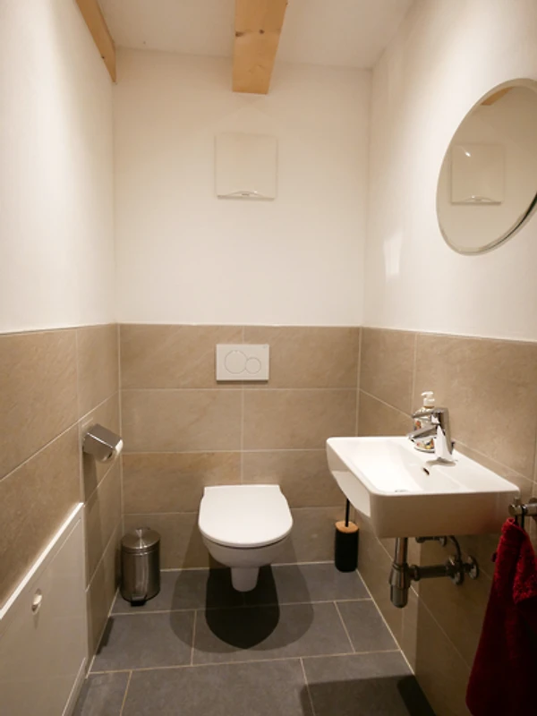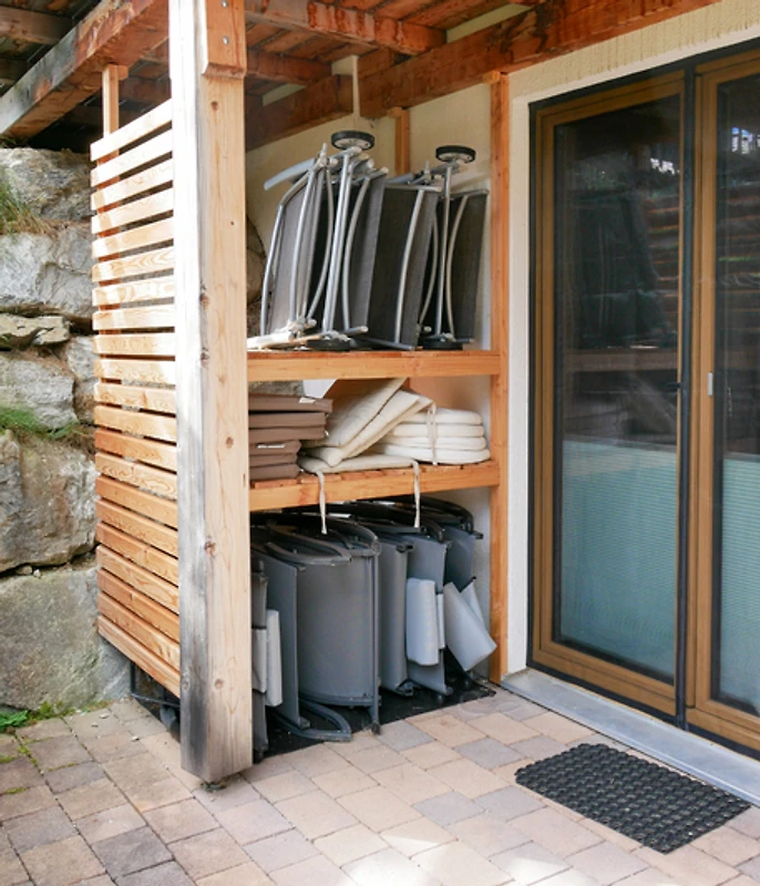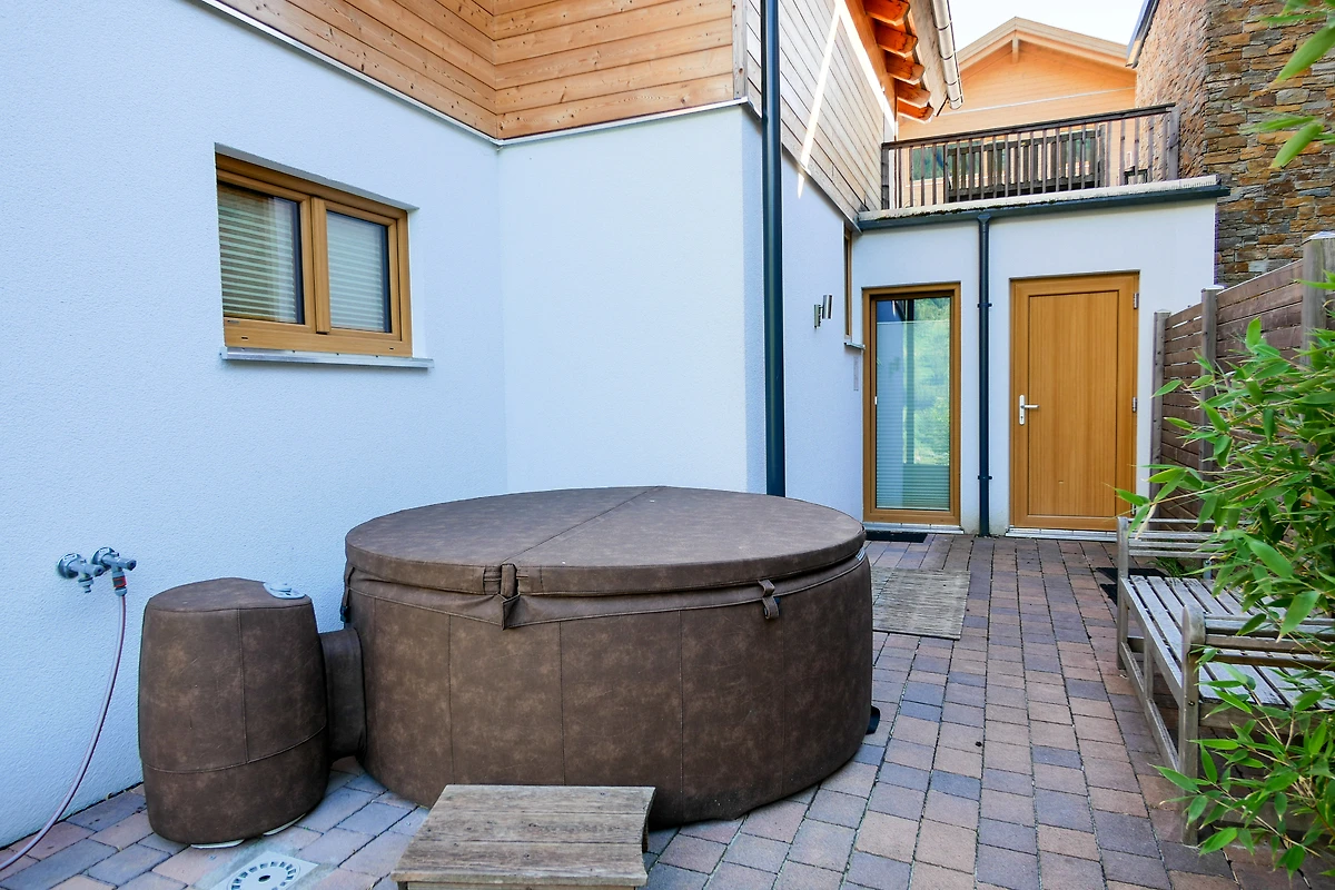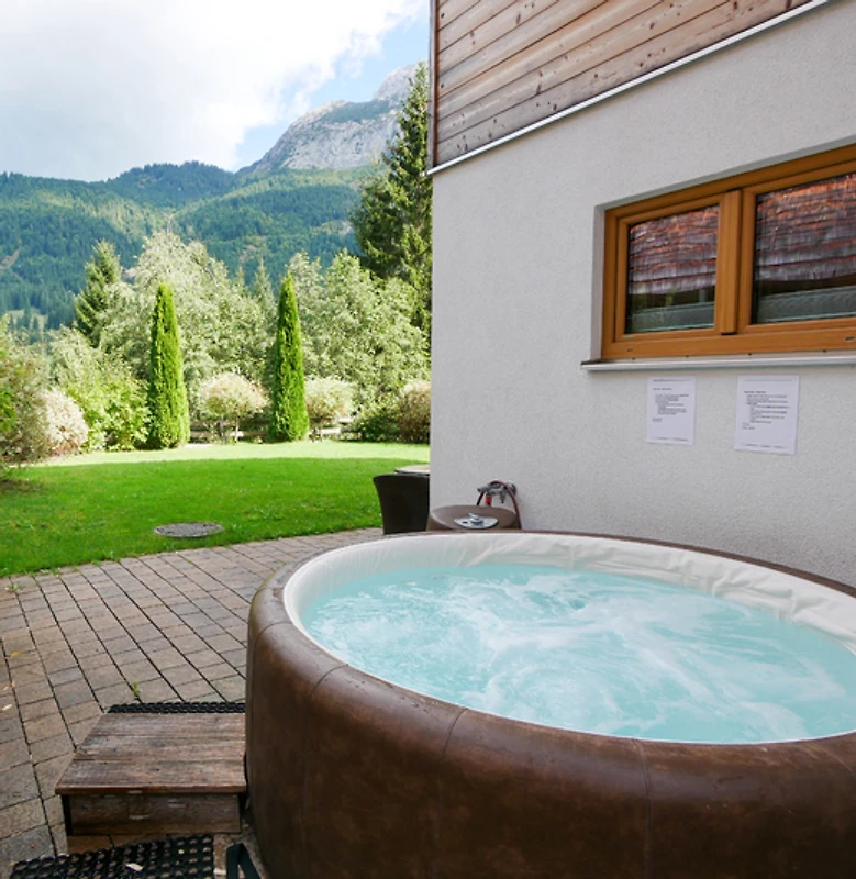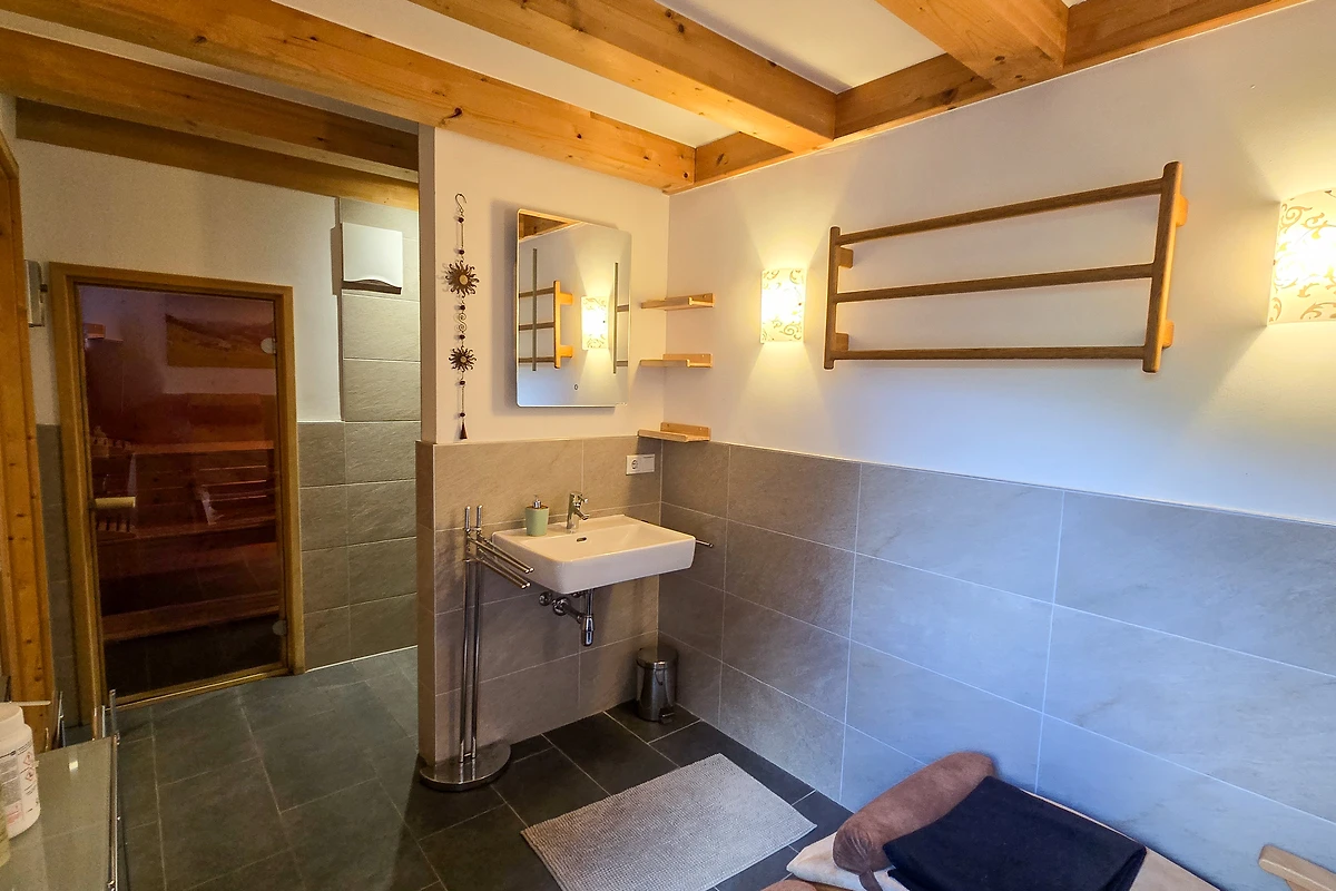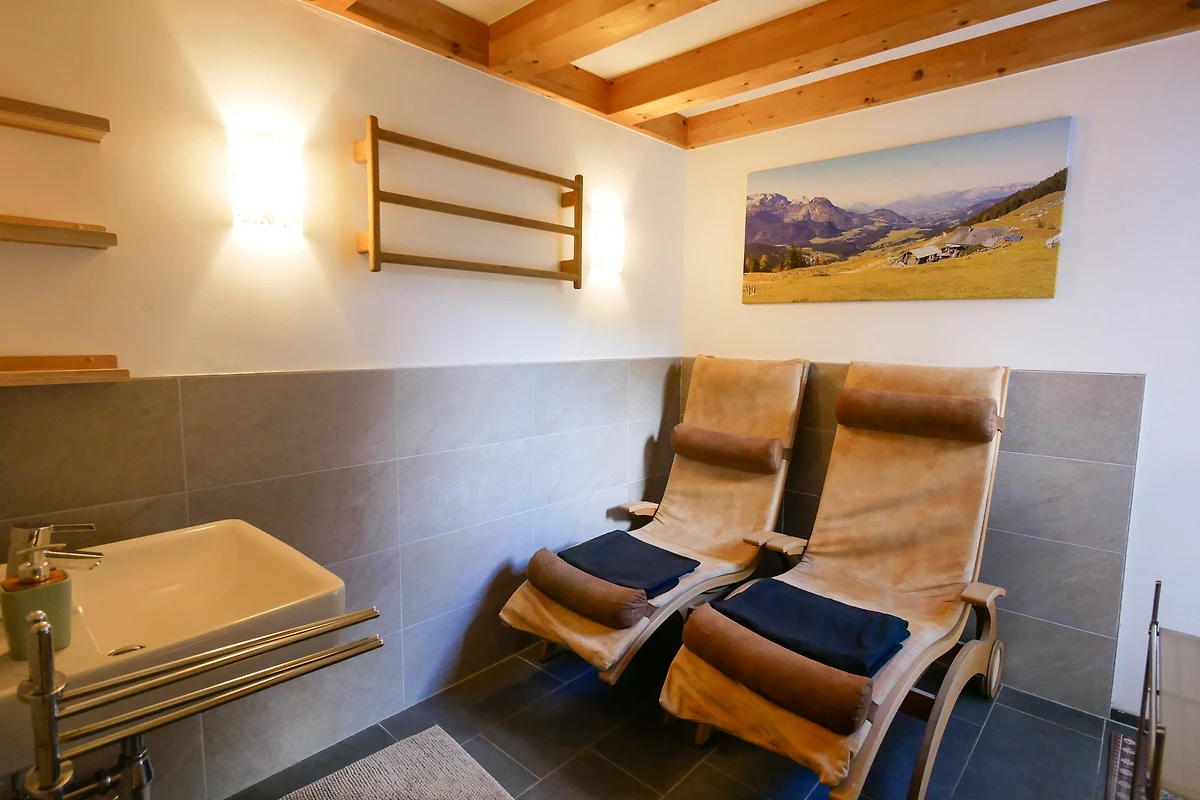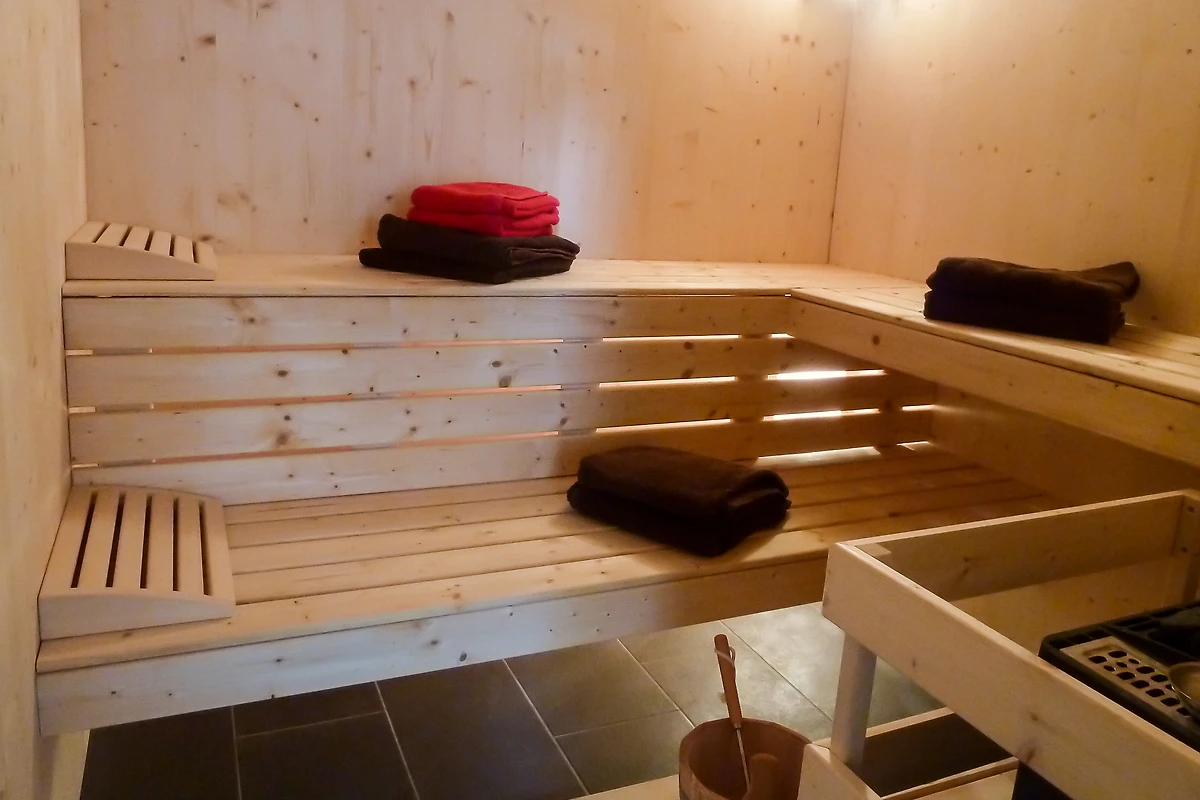 De sauna kan als bio-stoomsauna of Finse sauna worden gebruikt. Samen met de ontspanningsruimte bevindt zij zich eveneens in het souterrain. Vanuit de ontspanningsruimte komt men ook in de tuin om daar na de sauna af te koelen of om in het bubbelbad te stappen. In de buitenruimte zijn een barbecue en een tafel met extra zitplaatsen beschikbaar, evenals ligstoelen om te ontspannen. In de 200 m² grote, omheinde tuin kunnen de kinderen in de zomer in de zandbak spelen, in het opzetzwembad spetteren en onbezorgd rondrennen. In de winter bouwen onze kleine gasten graag iglo’s of sneeuwpoppen in de tuin.
