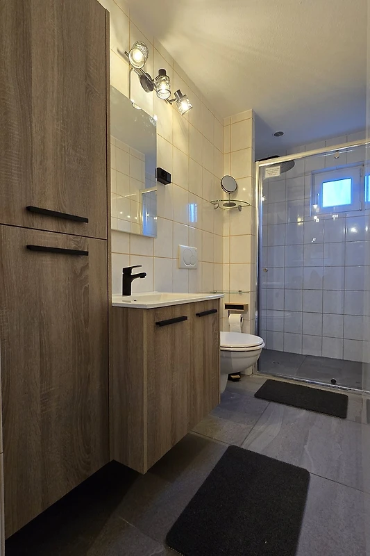 De moderne badkamer bevat een douche en een WC. Op de eerste verdieping is er nog een WC.